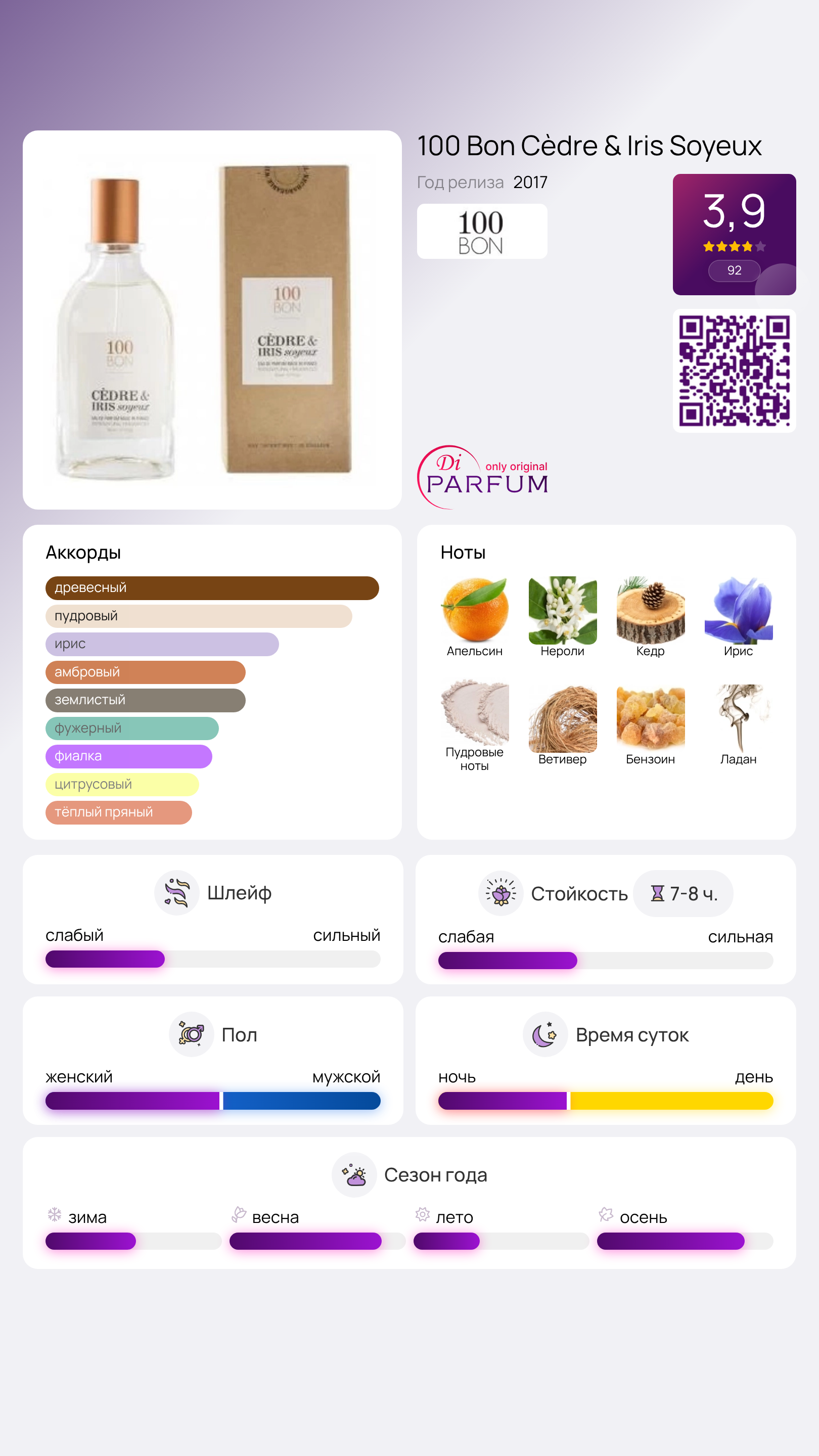 В верхних нотах вас встретит освежающий апельсин, который в сочетании с нероли дарит легкость и солнечную атмосферу. Далее вас ждет переход к более сложным и изысканным сердечным нотам, среди которых выделяются ирис и пудровые ноты, придающие аромату мягкость и утонченность.
