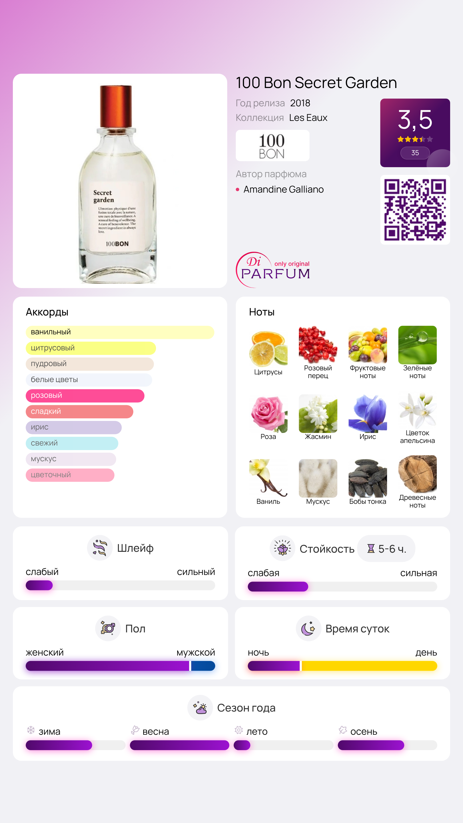 Аромат Secret Garden от 100 Bon – это не просто духи, а эмоциональное переживание, стремление слиться с природой. Флакон лаконичен, чем-то напоминает стеклянный пузырек из аптеки, с простой этикеткой, на которой упоминается секретный ингредиент – любовь.