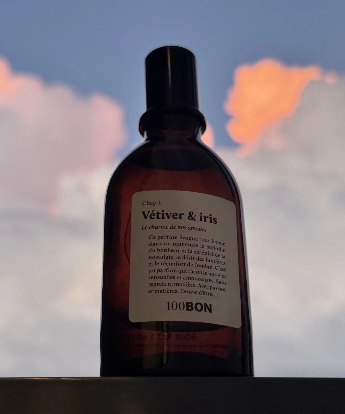 Изящный аромат Vetiver & Iris от 100 Bon вызывает ассоциации с тихим счастьем, пронизанным легкой ностальгией. Грусть по ушедшему исчезает в убаюкивающей темноте. Это история воспоминаний о минувших чувствах любви, без сожалений. Данная парфюмерная вода была выпущена в 2021 году французским брендом, созданным отцом и дочкой, которые стремятся создавать «парфюмерию здравого смысла».