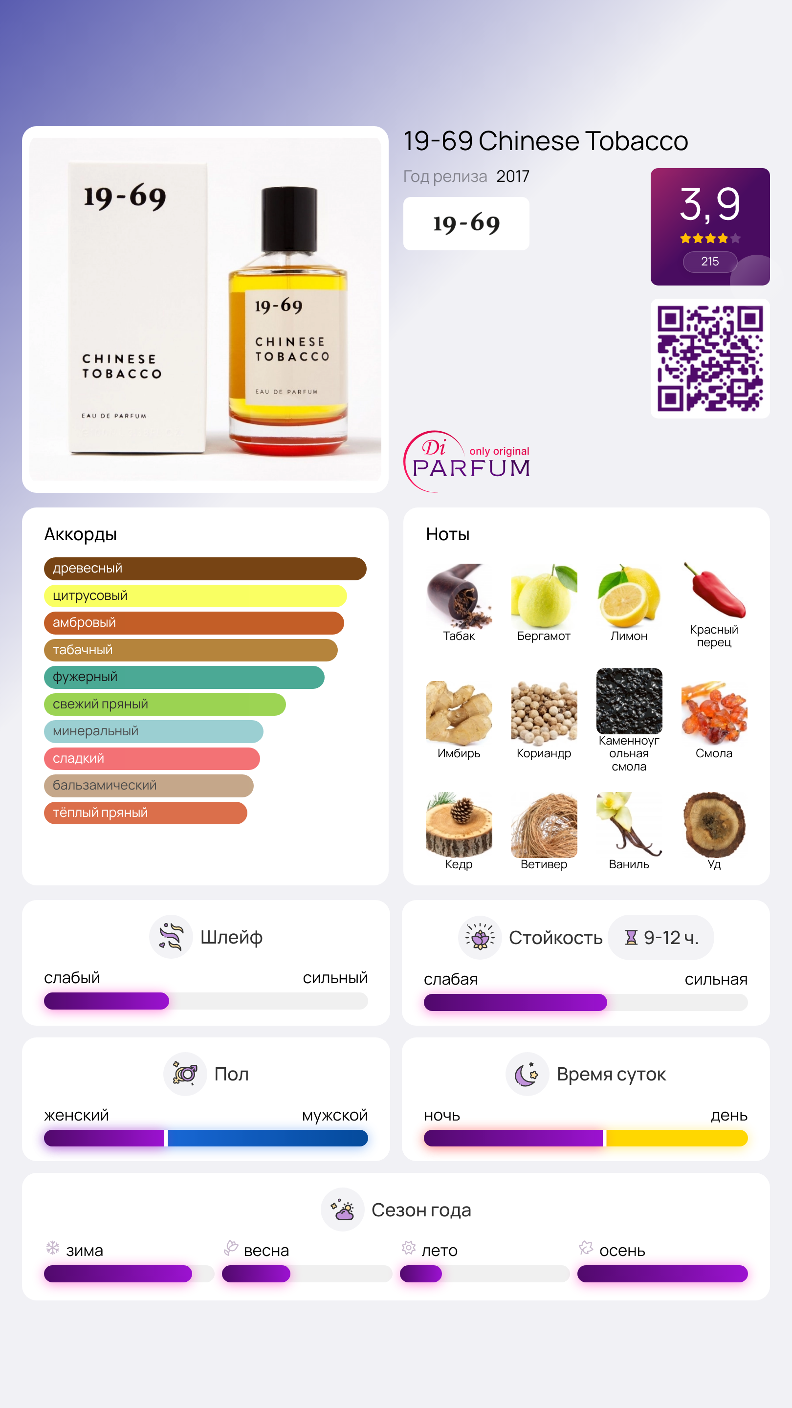 Элегантная аромакомпозиция Chinese Tobacco от 19-69 наполняет своего обладателя как мужчин, так и женщин теплом внутреннего уюта. Она создает атмосферу спокойствия и размеренности парфюмерного мира, свободного от суеты. Аромат призывает к уединению и возможности насладиться моментом с ближайшими людьми. Этот эликсир был представлен шведским брендом как часть дебютной коллекции из пяти ароматов, посвященной различным эпохам и эмоциям.