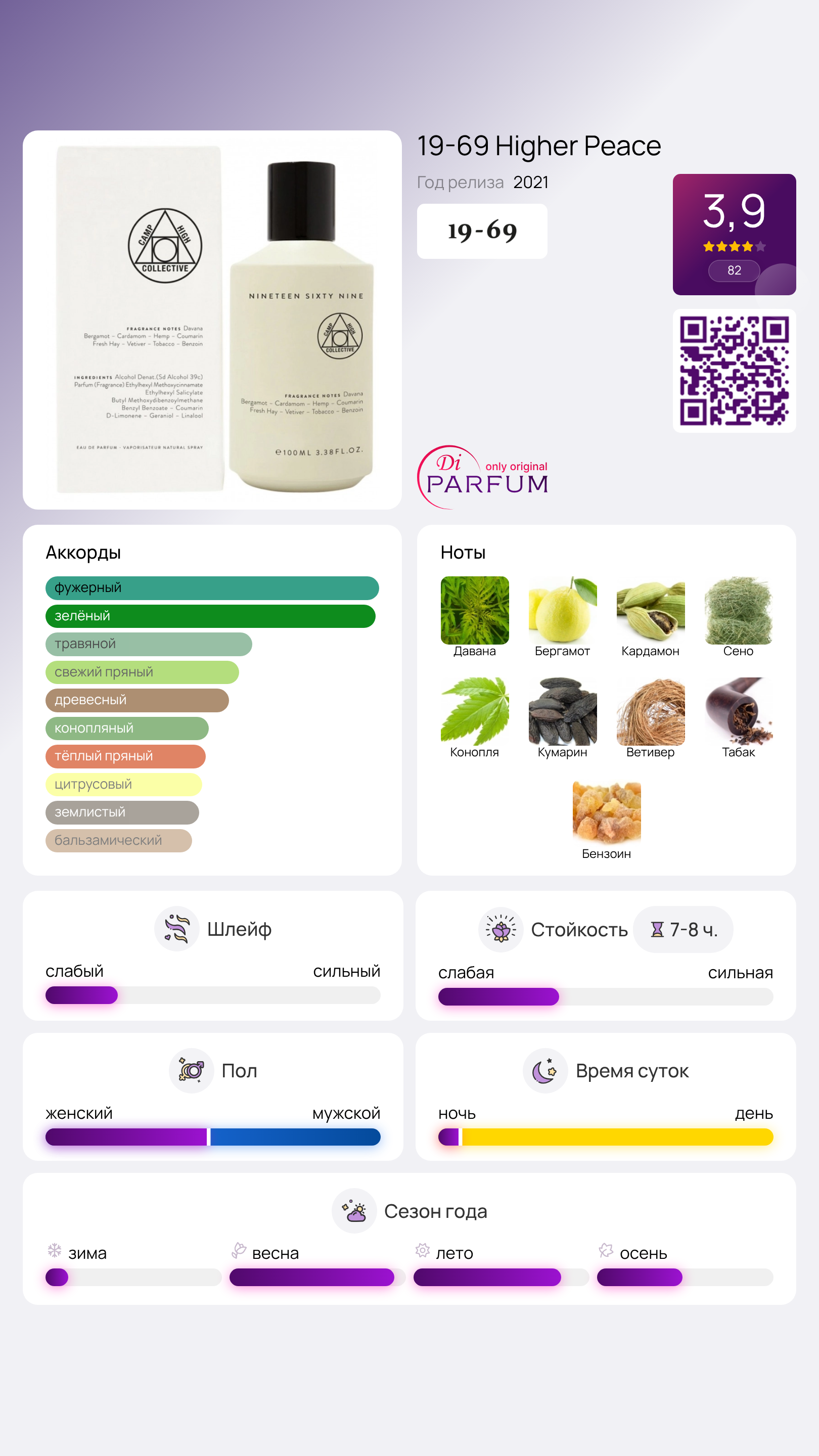 19-69 Higher Peace станет идеальным выбором для вечных мечтателей, готовых оставить повседневность ради путешествия в поисках новых смыслов. Вдохновляющими образами парфюмерии являются молодость, легкомысленность, свобода, творчество и любовь.