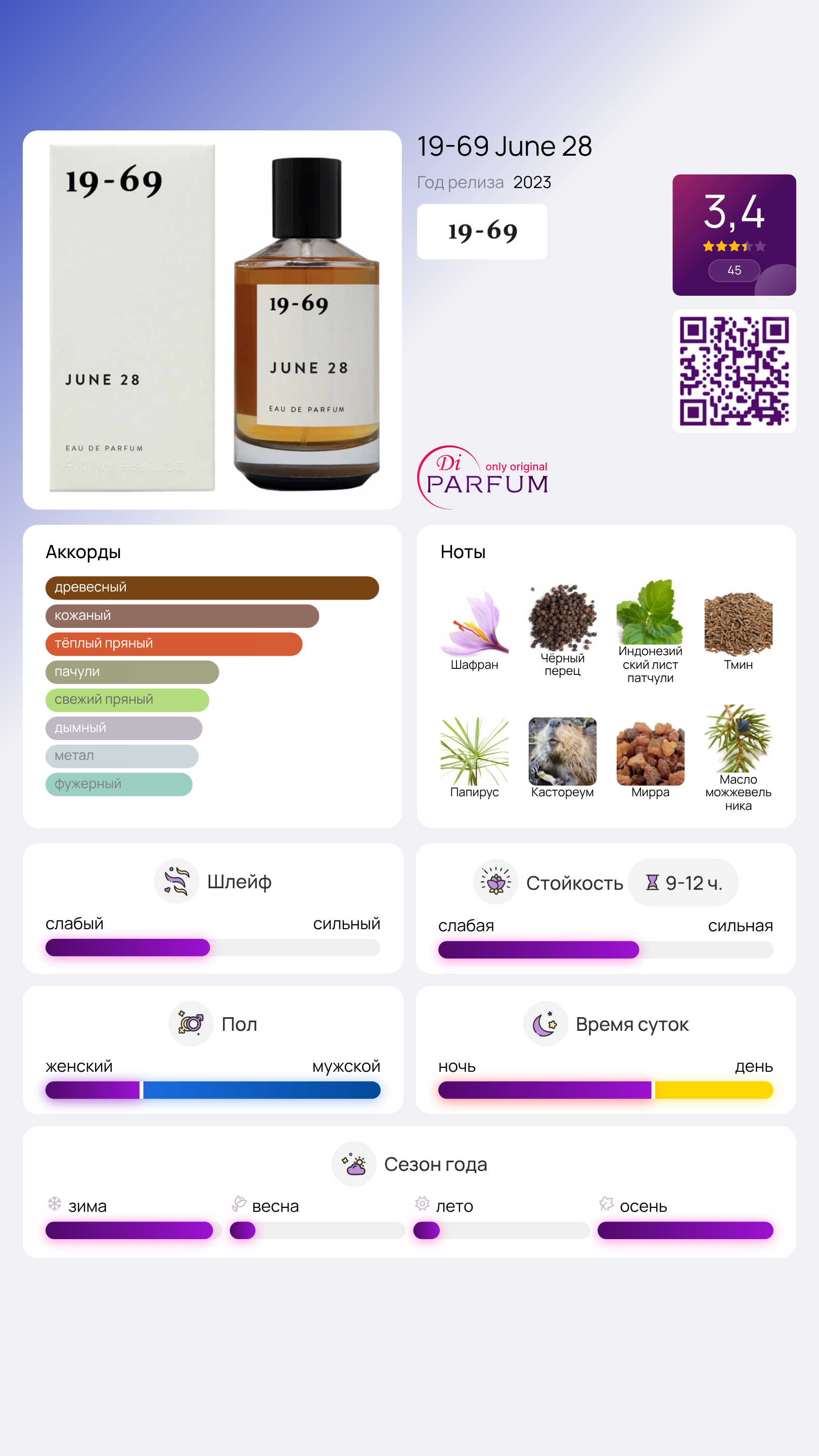 В дальнейшем раскрываются богатые землистые ноты пачули и пряно-древесные оттенки кумина. Особенно акцентированы кожаные нюансы кастореума, бальзамические акценты мирры и можжевельника создают уникальную и выраженную базу аромата. Завораживающий шлейф 19-69 June 28 олицетворяет неудержимый дух страсти, в котором древесные, кожаные и пряные ноты переплетаются, образуя симфонию свободы и самовыражения.
