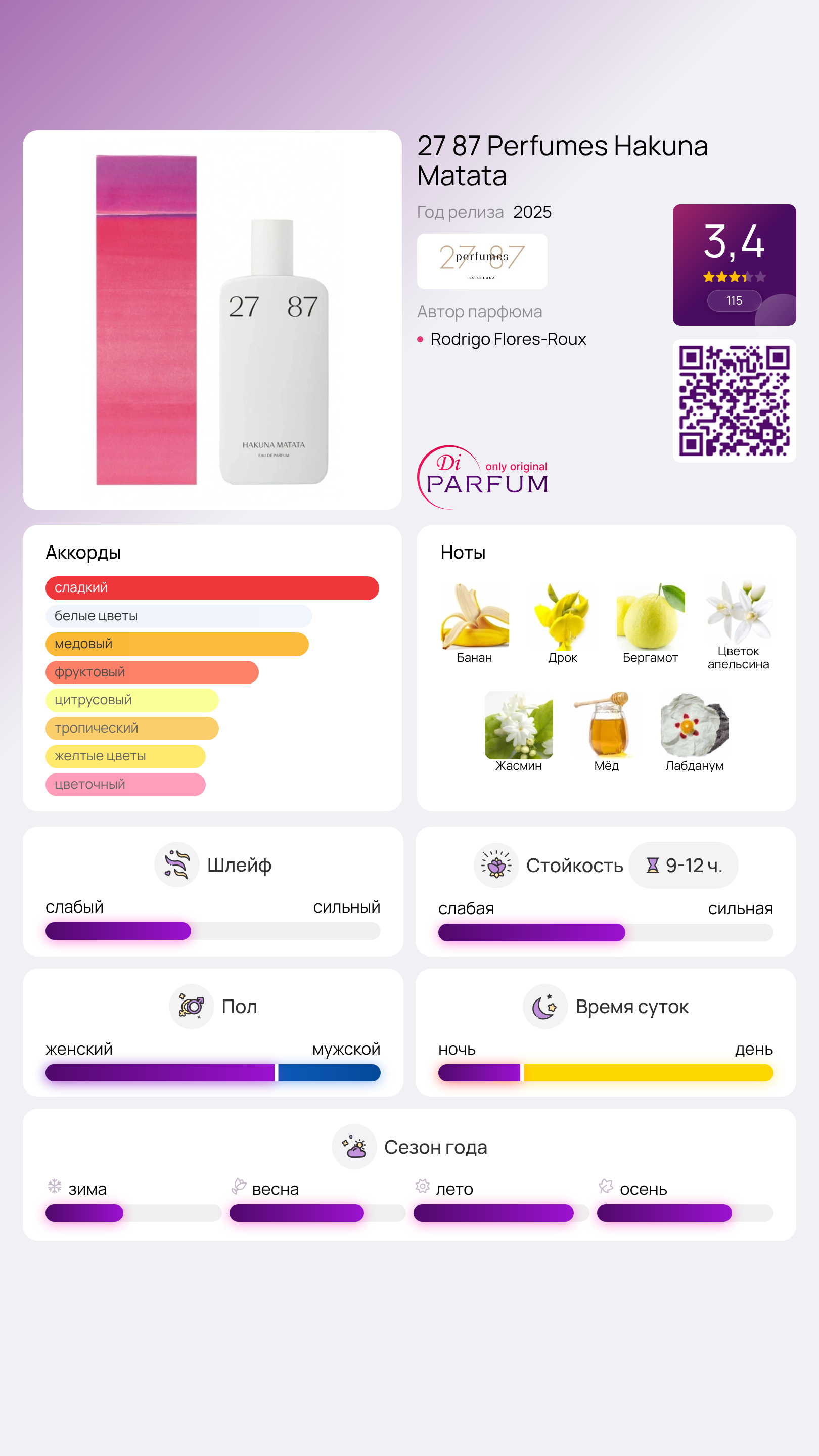 В шлейфе 27 87 Perfumes Hakuna Matata мед мягко окутывает кожу золотистым сиянием, в то время как ладан добавляет лёгкую дымность, вызывая образы отдалённого костра на закате. Этот аромат не стремится удивить сложными нюансами; он предлагает то, что так не хватает в современном мире: лёгкость, солнечное настроение и важное напоминание о том, что иногда лучшая трактовка жизни — это просто быть счастливым.