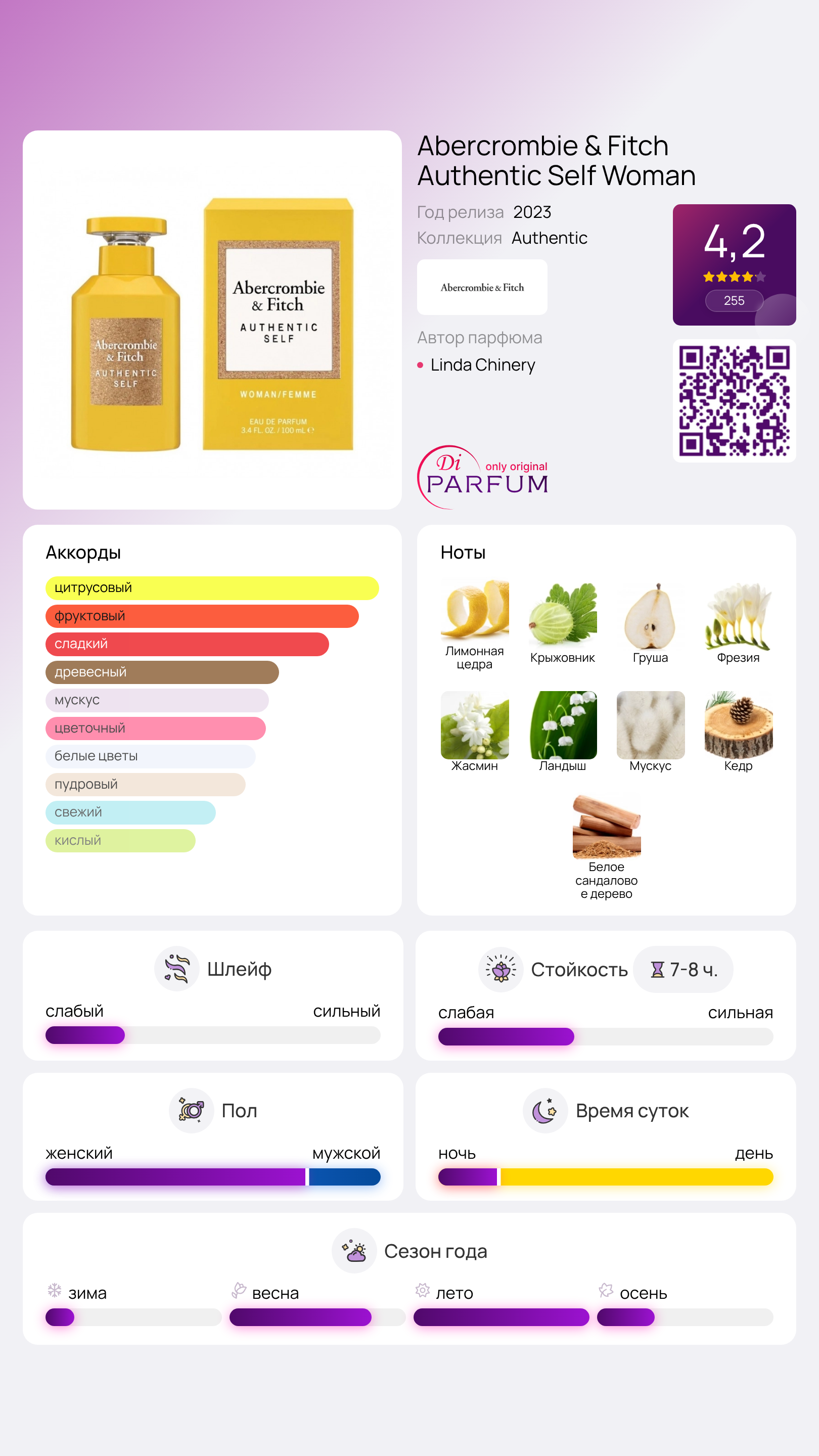 Тонкая цветочная и фруктово-древесная композиция Abercrombie & Fitch Authentic Self Woman предназначена для вдохновения женщин, которые знают, что такое уверенность. Эти прекрасные дамы считают свой стиль уникальным и надежно придерживаются своих решений. Как указано в официальном пресс-релизе, основная идея этих духов заключается в желании свободно выражать себя.