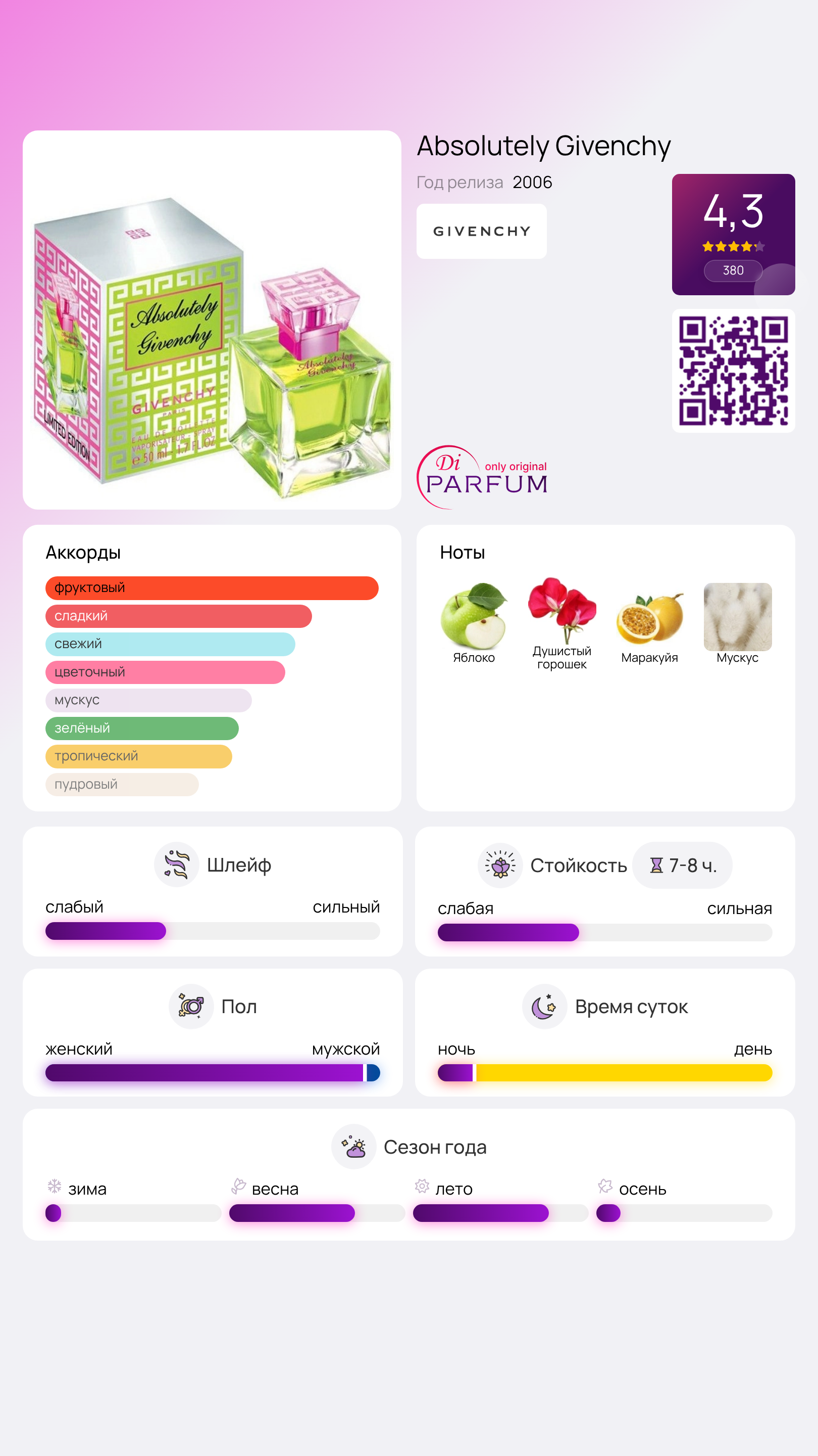 Такой уникальный микс способен разрушить обыденность городской жизни, наполняя каждую женщину безграничным оптимизмом и энергией. Absolutely Givenchy моментально привлекает своей уникальностью, постоянной свежестью и юношеским задором. Этот фруктово-цветочный парфюм создается на основе сложного смешения нот, включая яблоко, пассифрут, душистый горошек и мускусную древесину.