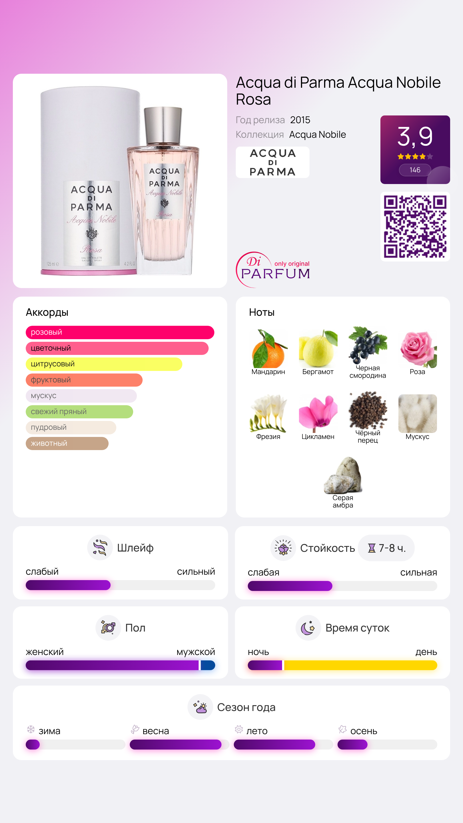Парфюм обладает цветочным букетом, который начинается с яркого цитрусового аккорда, дополненного острым перцем. Затем аромат плавно переходит в насыщенные цветочные ноты, а к финалу проявляются элегантные нюансы амбры и свежего кедра, которые звучат на фоне серого янтаря и нежного мускуса.
