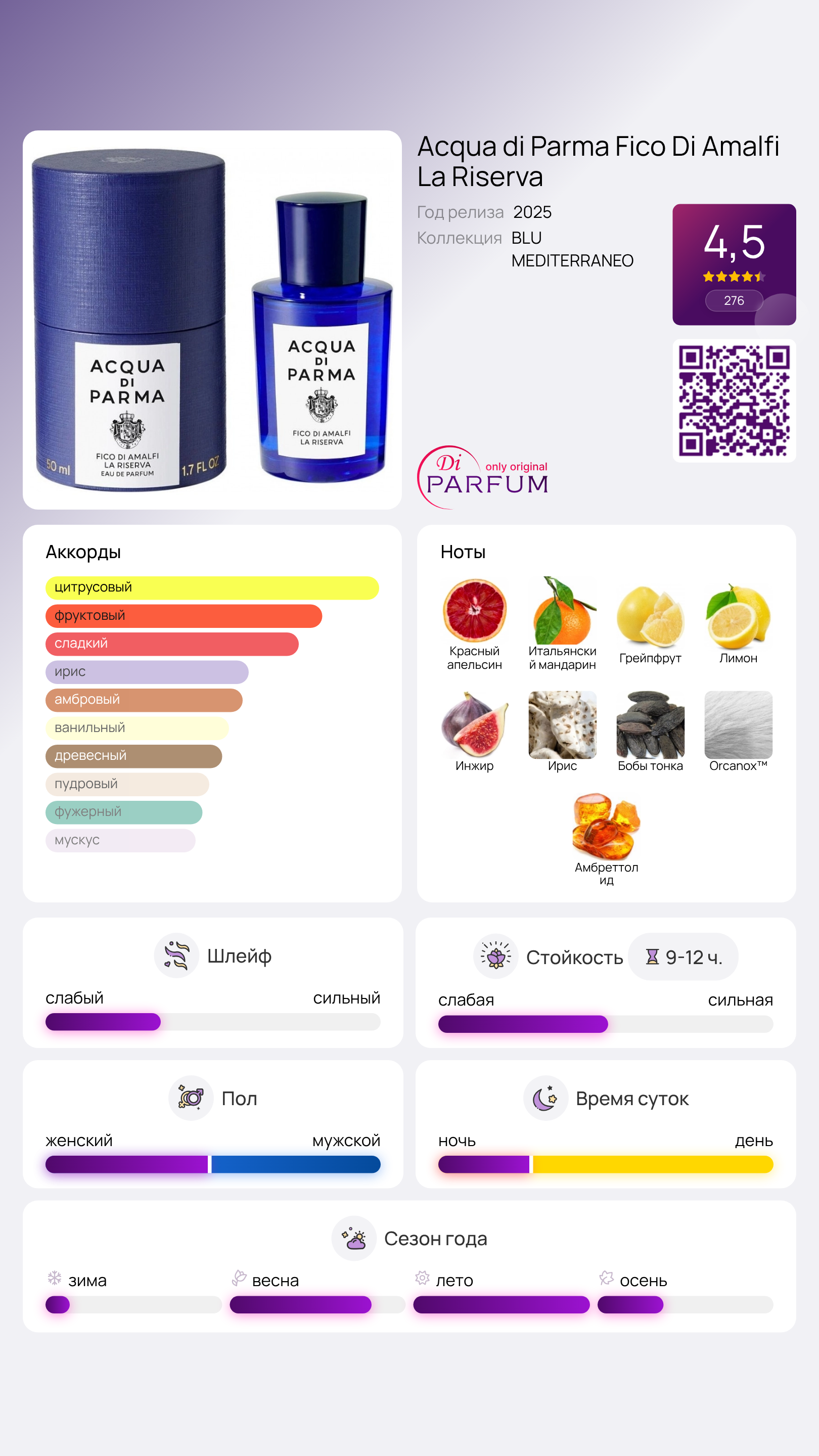 Fico di Amalfi La Riserva входит в семьи цитрусовых, фруктовых и древесных ароматов. Он станет прекрасным выбором для тех, кто ценит свежесть и оригинальность, привнося в повседневный образ нотки летнего солнечного света.