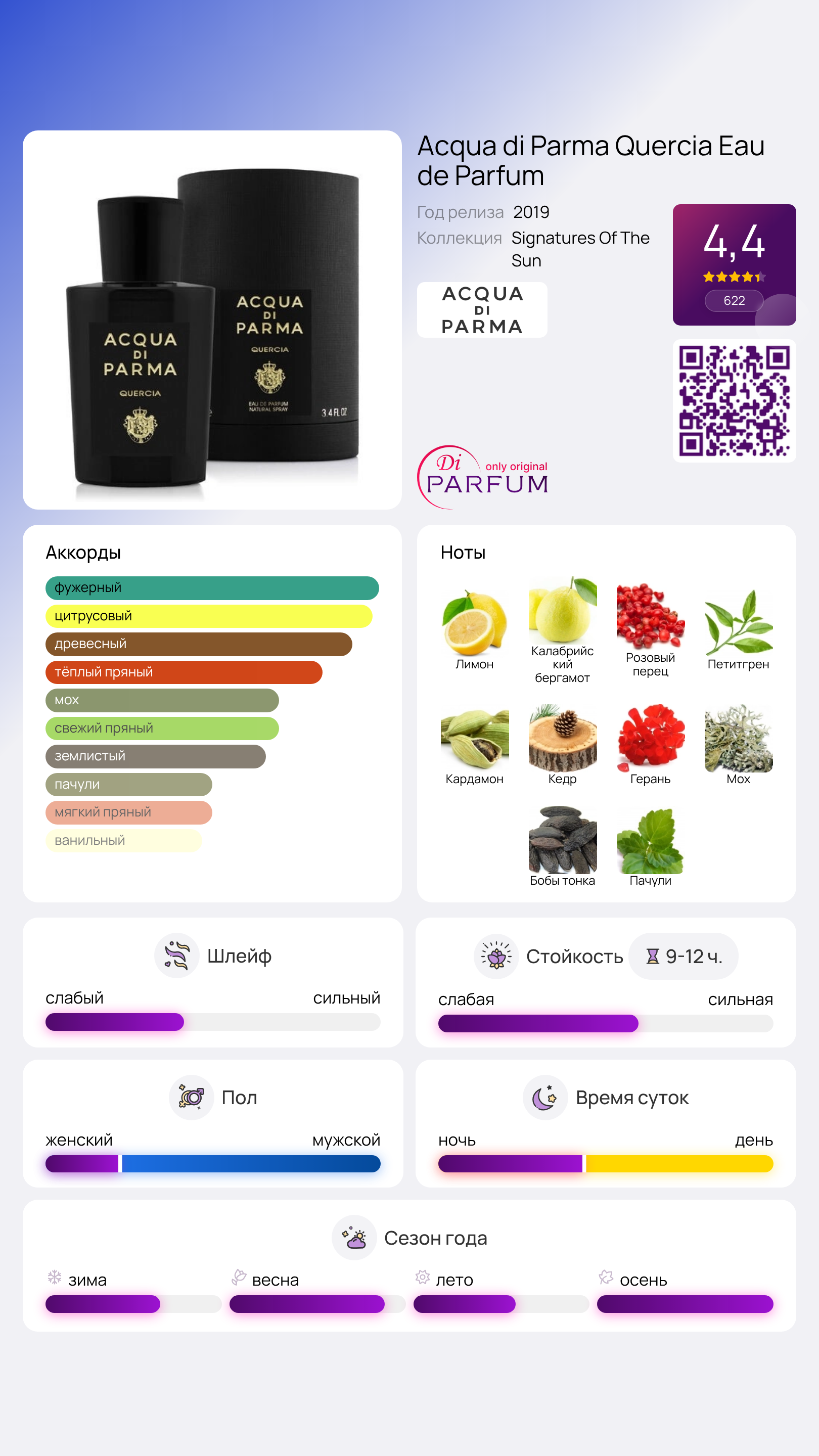 Аромат Acqua di Parma Quercia Eau de Parfum, представляющий собой фужерную древесную композицию, впервые увидел свет в 2019 году. Он стал обновленной интерпретацией знаменитого Colonia и был запущен в рамках коллекции Signatures Of The Sun. Как и все ароматы этой серии, Quercia включает в себя богатую палитру ингредиентов, собранных из разных уголков планеты, вызывая ассоциации с солнечными днями на лучших итальянских курортах.