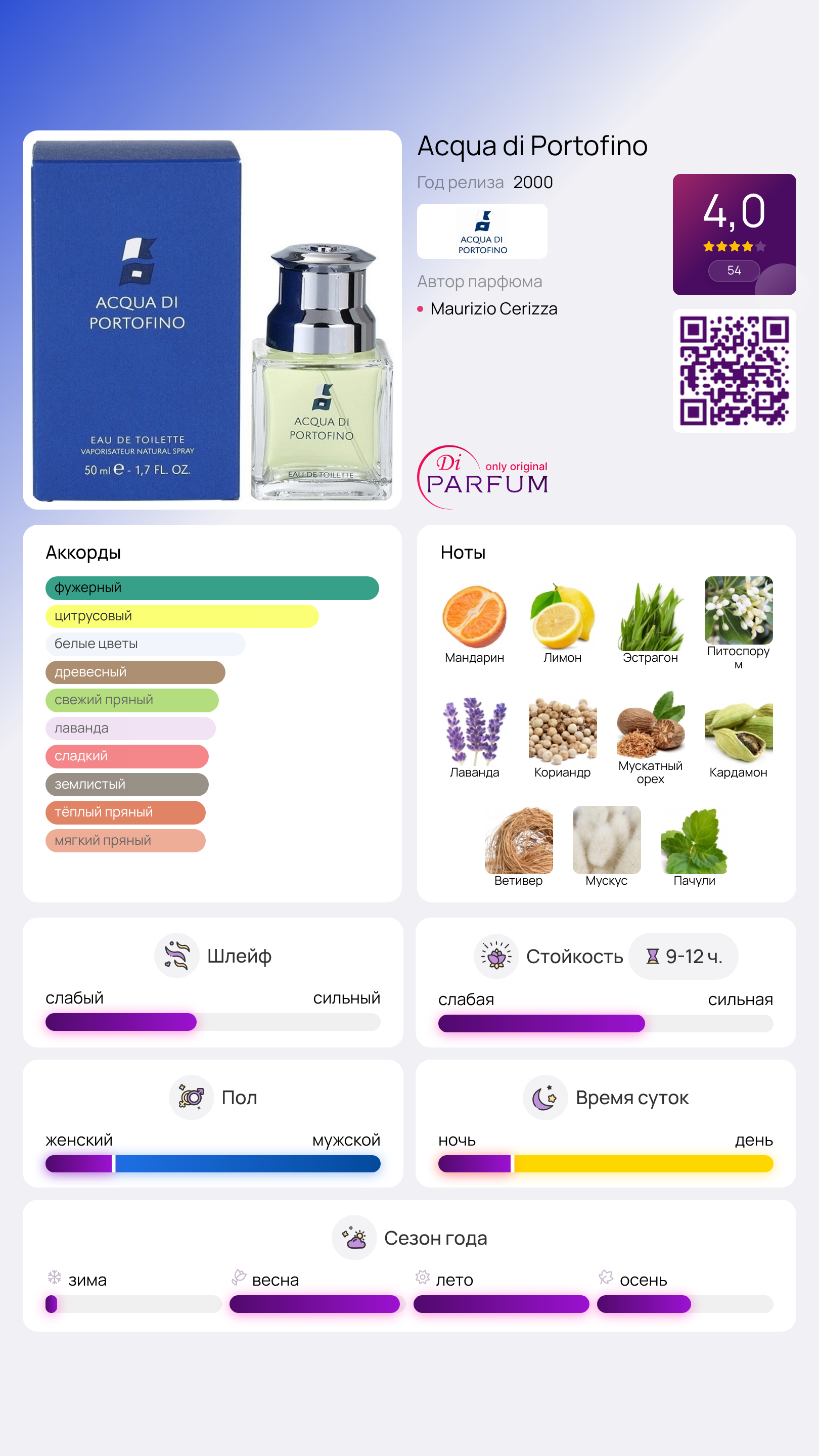 Acqua di Portofino от Acqua di Portofino – это древесно-ароматический парфюм, созданный для мужчин и женщин. Он был представлен на рынке в 2000 году и мгновенно стал символом свежести и энергии. Парфюмером, разработавшим этот заслуженный аромат, является Maurizio Cerizza.
