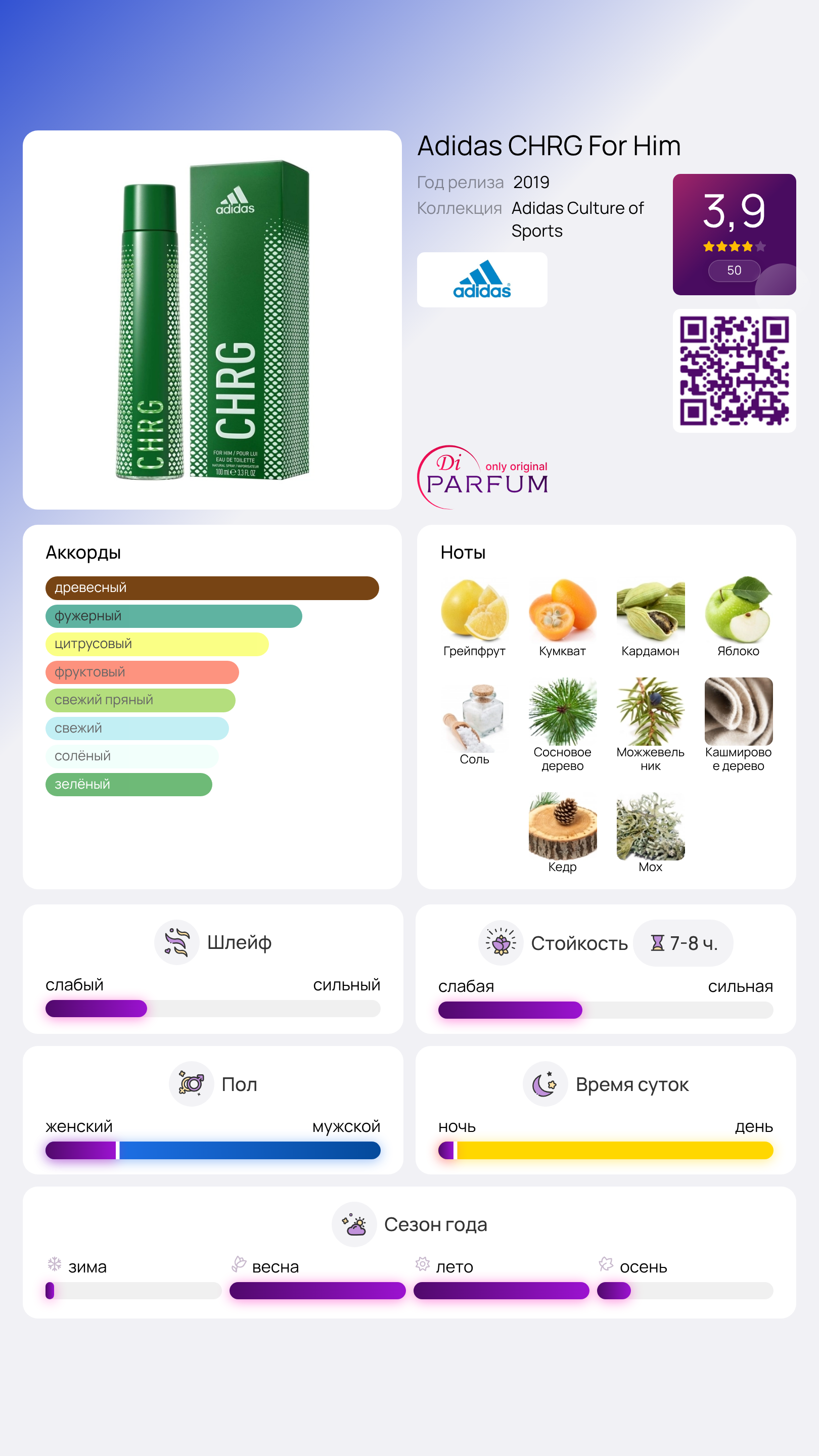 Аромат CHRG For Him от Adidas является идеальным компаньоном в стремлении к цели. Он стал настоящей жемчужиной коллекции, ориентированной на эмоции, вдохновленные спортом. Этот универсальный парфюм подходит для любых обстоятельств — как в личной жизни, так и в деловых отношениях. Аромат был выпущен в 2019 году американским брендом, известным производителем спортивной одежды.