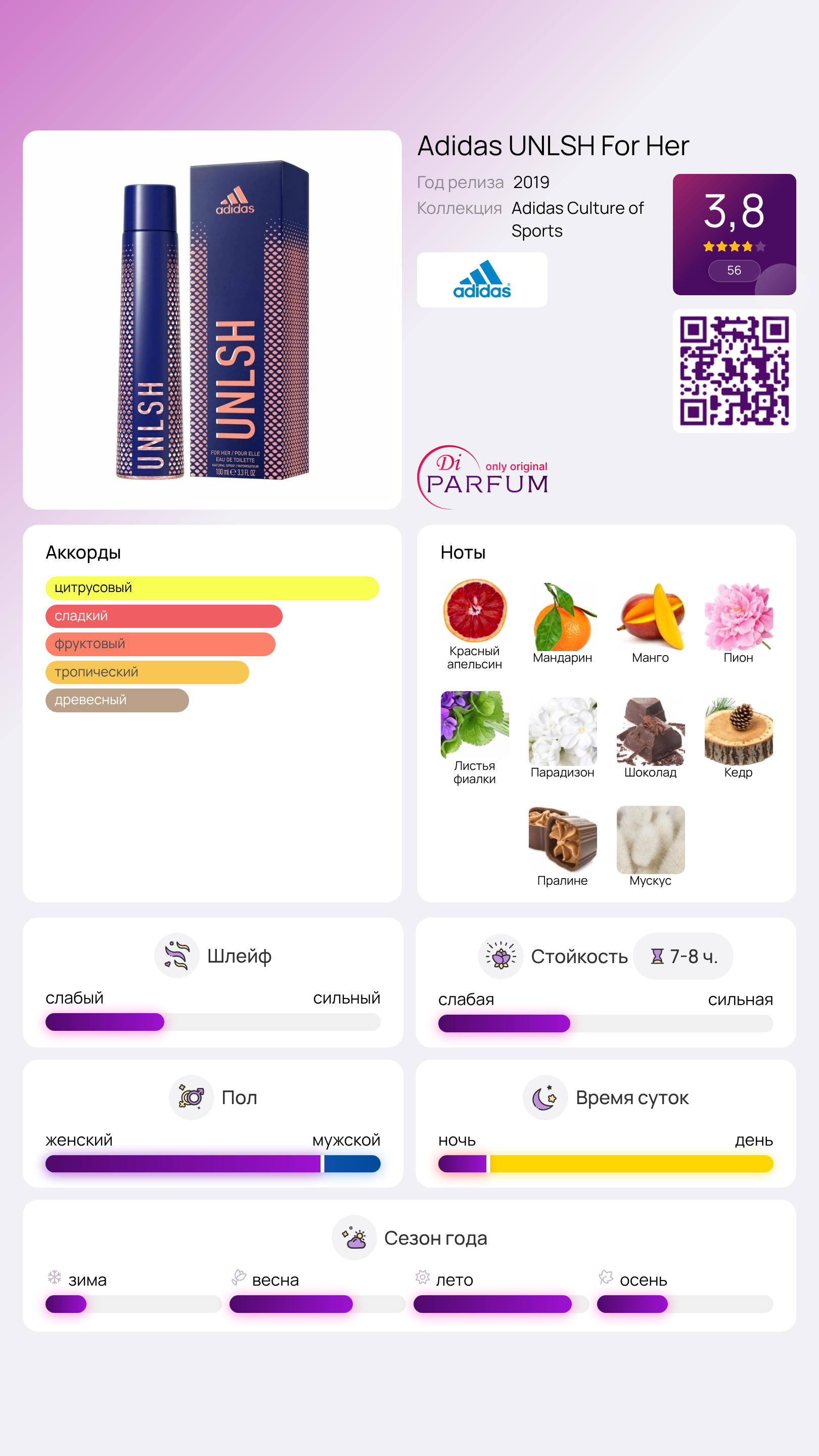 Adidas UNLSH For Her представляет собой яркий фруктово-цветочный парфюм для уверенной женщины, стремящейся к новым достижениям и вызывающей восхищение своей индивидуальностью. Образ, созданный этим ароматом, включает в себя стиль, немного дерзости, энергию, целеустремленность и привлекательность, что делает его идеальным дополнением для яркой и активной натуры.