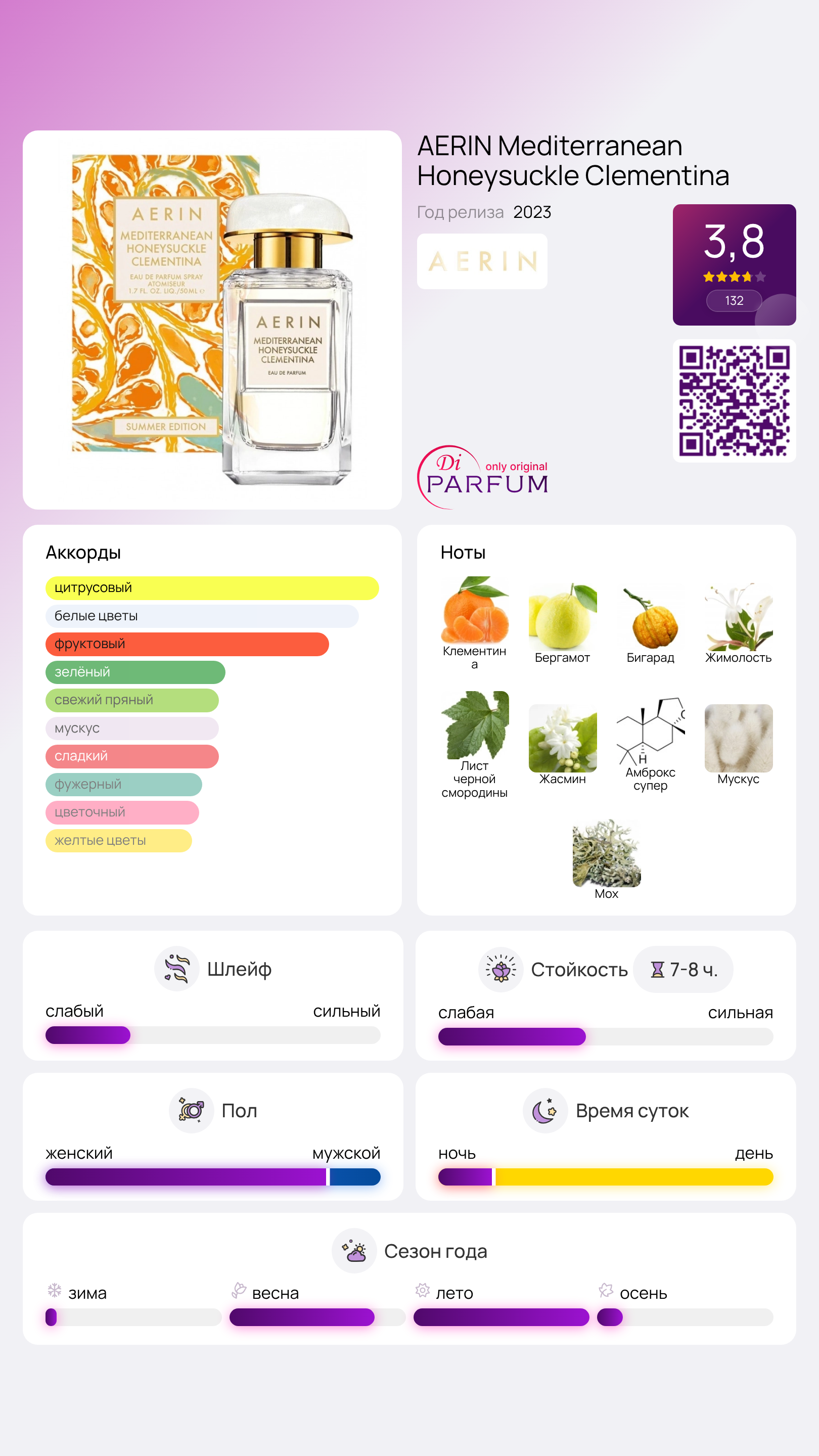 Сначала аромат поражает ярким цитрусовым взрывом: апельсин, клементин и бергамот создают ощущение свежевыжатого сока, поданного на террасе с морским видом. В сердце аромата жасмин и жимолость добавляют нежные цветочные акценты, а черная смородина вносит легкую кислинку, напоминающую о прогулках по виноградникам.