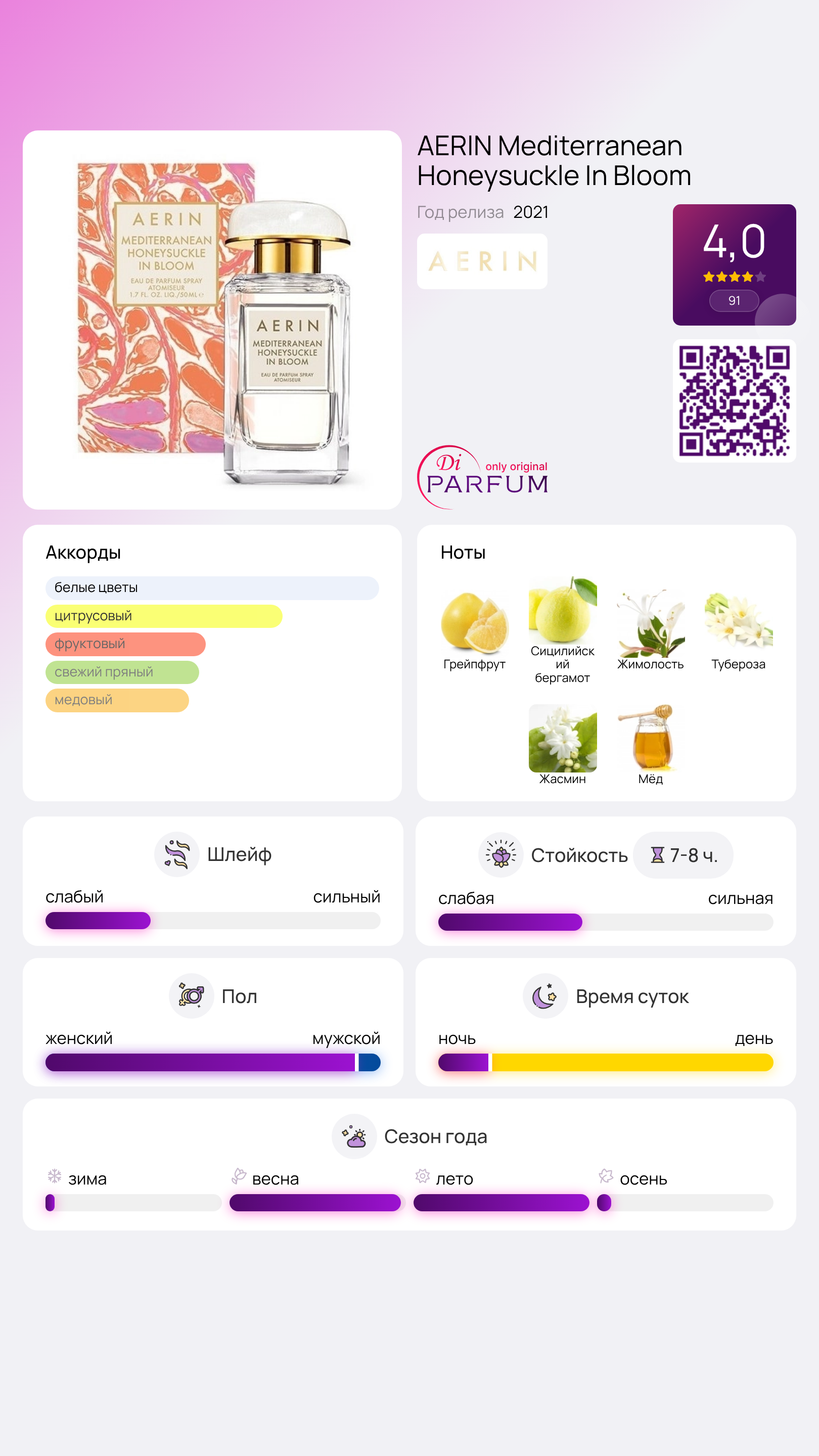 AERIN Mediterranean Honeysuckle In Bloom – это яркий аромат с экзотическим характером, который привлекает внимание к нежности его обладательницы. Эта лимитированная версия популярного аромата 2015 года была представлена в 2021 году и адресована женщинам, любящим путешествия и открытия новых горизонтов, которые запечатлевают свои впечатления на снимках. Классический прозрачный флакон сохраняет стильный и элегантный вид.