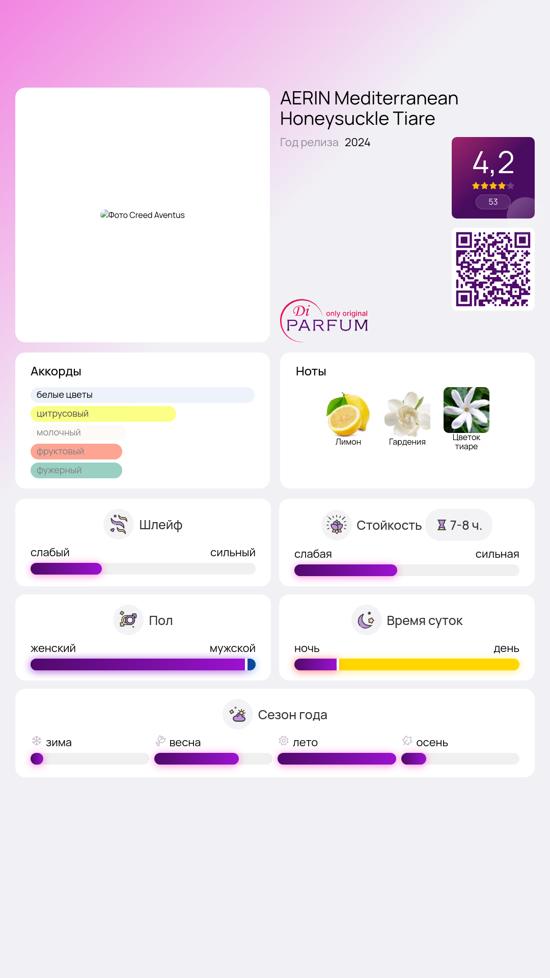Этот аромат станет идеальным выбором для тех, кто ищет свежести и элегантности в одном флаконе. Mediterranean Honeysuckle Tiare запоминается и оставляет за собой невидимый след, отражая индивидуальность своей обладательницы.