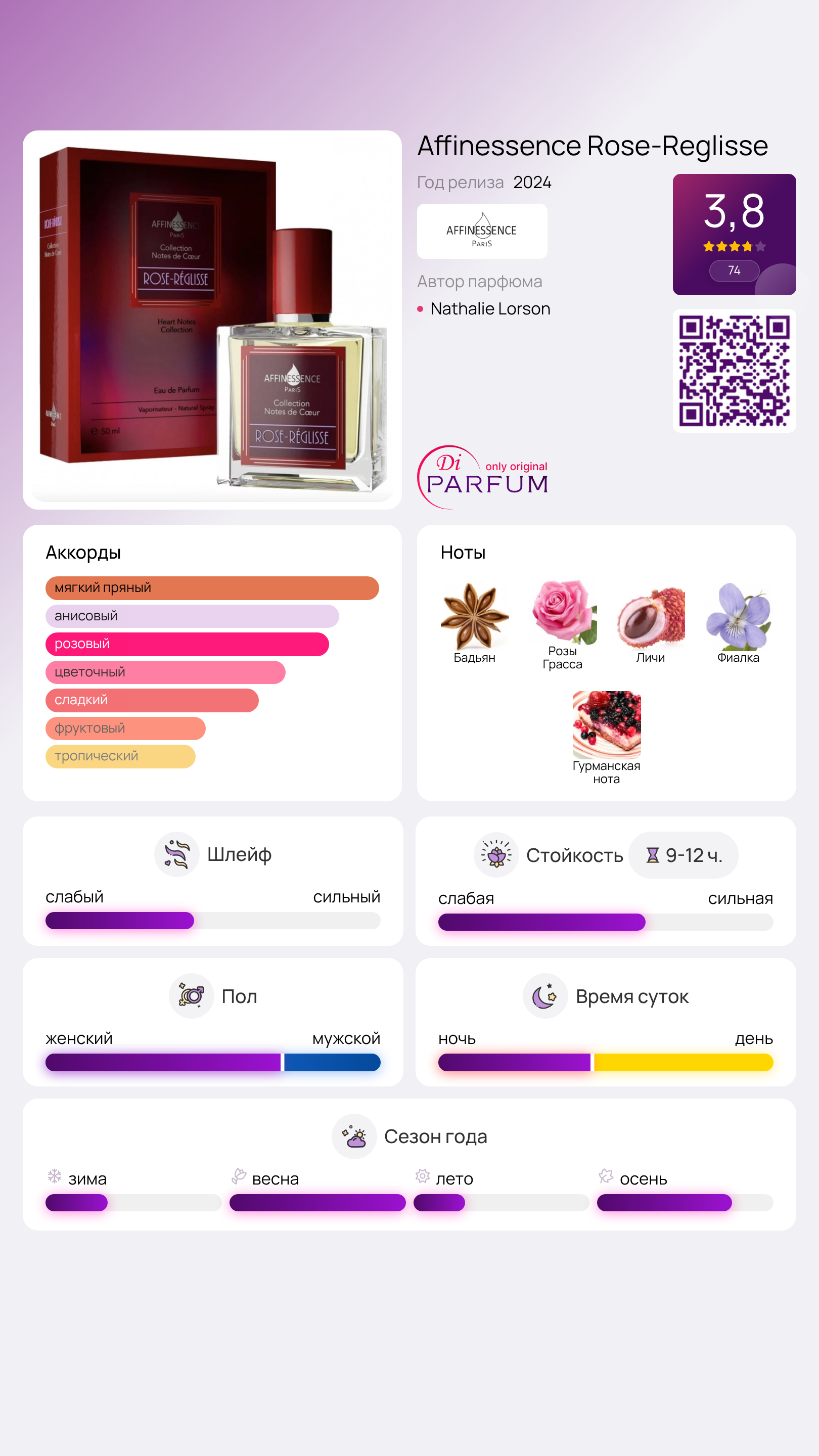 Rose-Reglisse подходит для тех, кто ищет что-то необычное и масштабное в мире парфюмерии. Этот аромат станет отличным выбором как для повседневного использования, так и для особых случаев, легко подчеркивая индивидуальность своего обладателя.