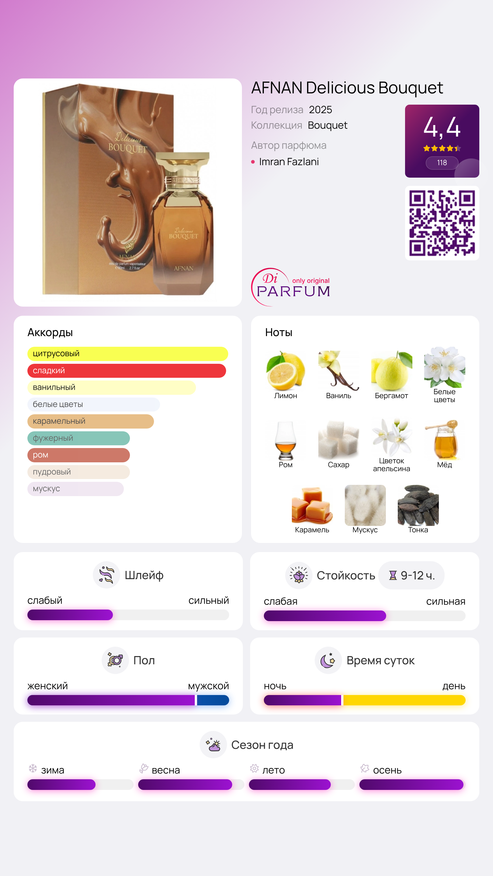 Delicious Bouquet от Afnan - это цитрусовый гурманский аромат для женщин. Этот новый аромат был представлен в 2025 году, его создателем является парфюмер Имран Фазлани. В верхних нотах можно услышать сочетание лимона, ванили, бергамота и белых цветов, которые создают свежую и яркую гармонию. Сердце аромата наполнено нотами рома, сахара, цветка апельсина, меда и взбитых сливок, что придает ему сладость и интригующую многослойность. Завершающие аккорды состоят из карамели, ванили, мускуса и бобов тонка, создавая теплую и уютную основу.