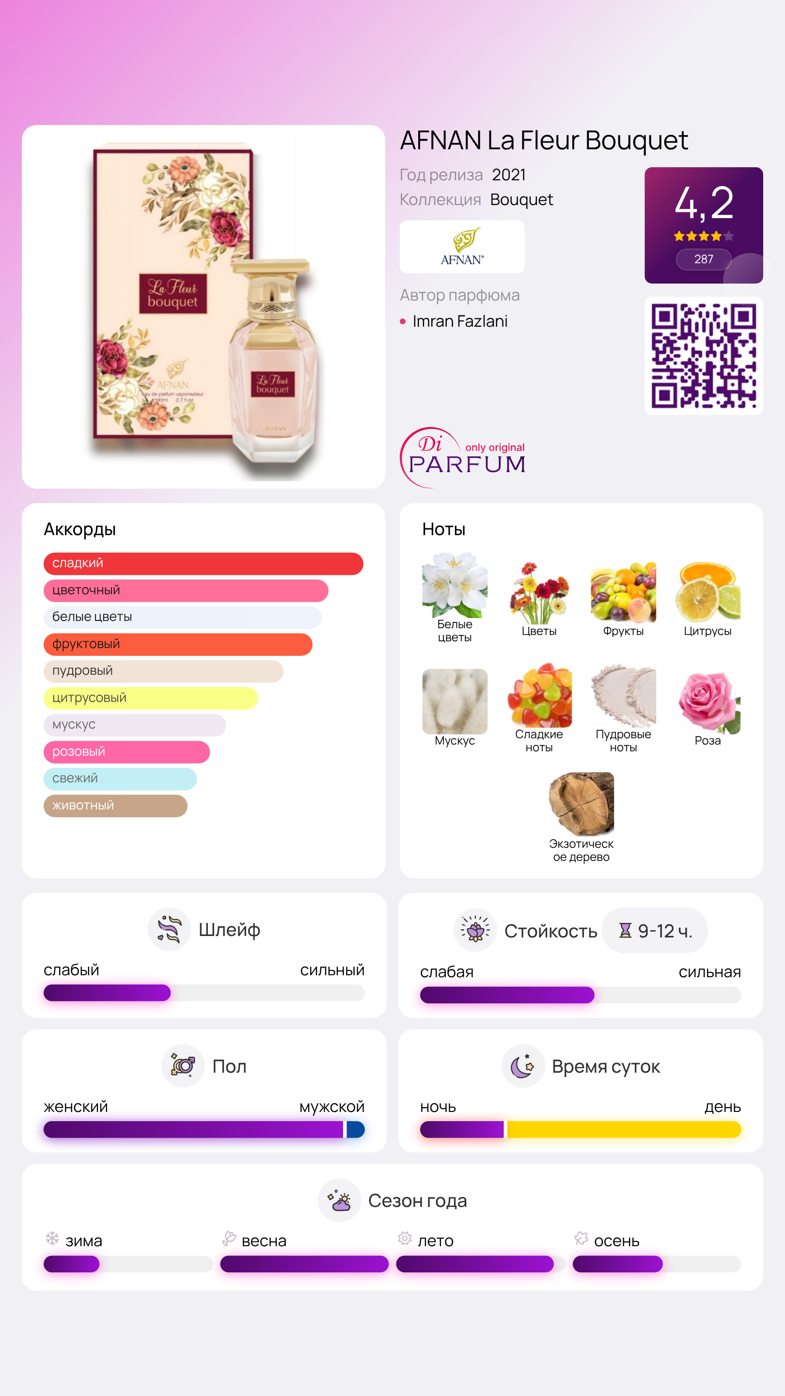 Финальные ноты немного отклоняются от традиционных восточных мотивов, основываясь на тропической древесине, пудровых и сладких аккордах в сопровождении душистой розы, формируя женственный и невероятно чувственный аромат AFNAN La Fleur Bouquet.