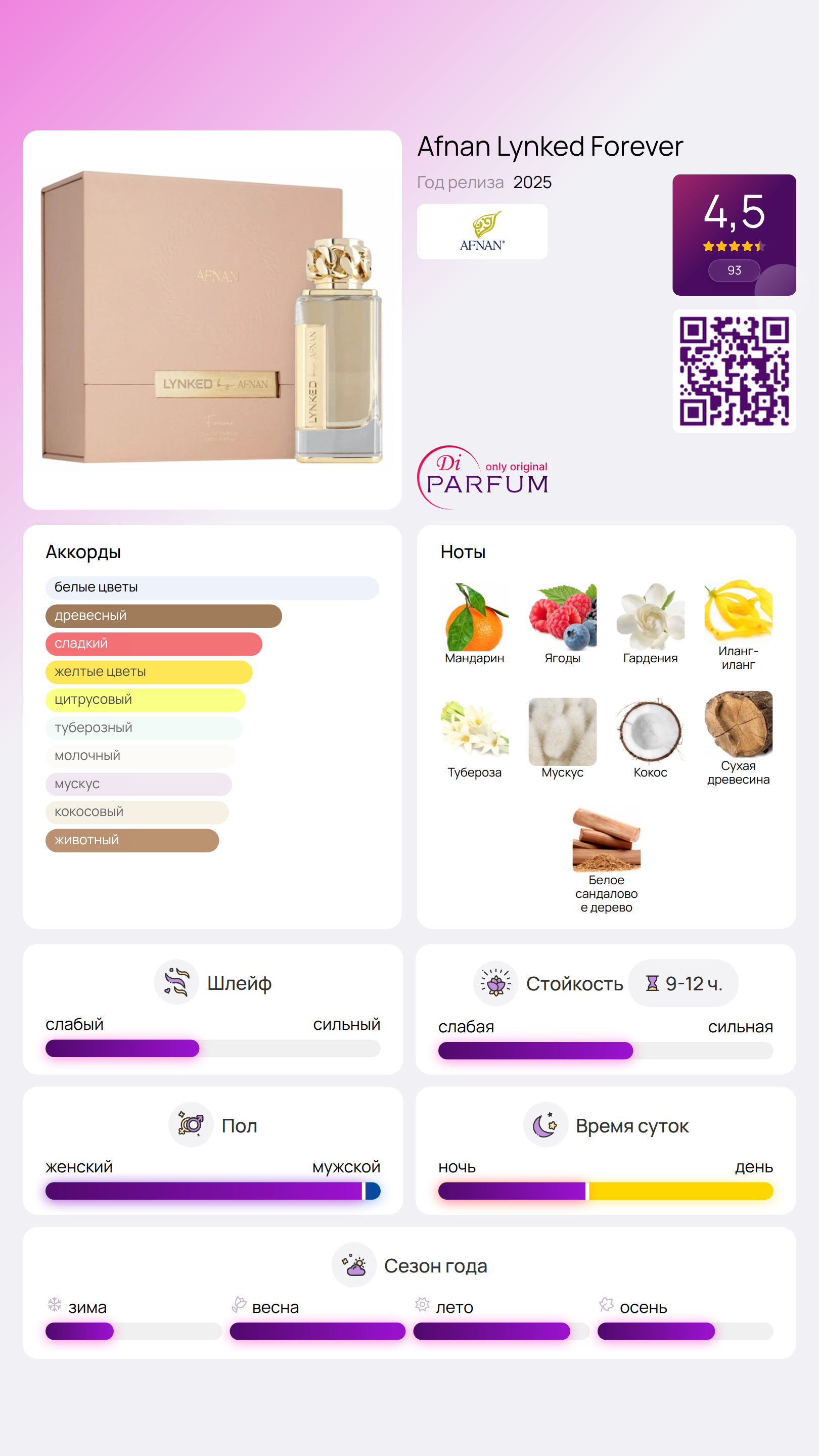 Lynked Forever от Afnan — это новый цветочно-фруктовый аромат для женщин, который был представлен в 2025 году. За его созданием стоит известный парфюмер Жан-Луи Сёзак. Аромат открывается яркими и свежими нотами мандарина и лесных ягод, переходя к сердцу композиции, наполненному изысканными белыми цветами гардении, иланг-илангом и туберозой.