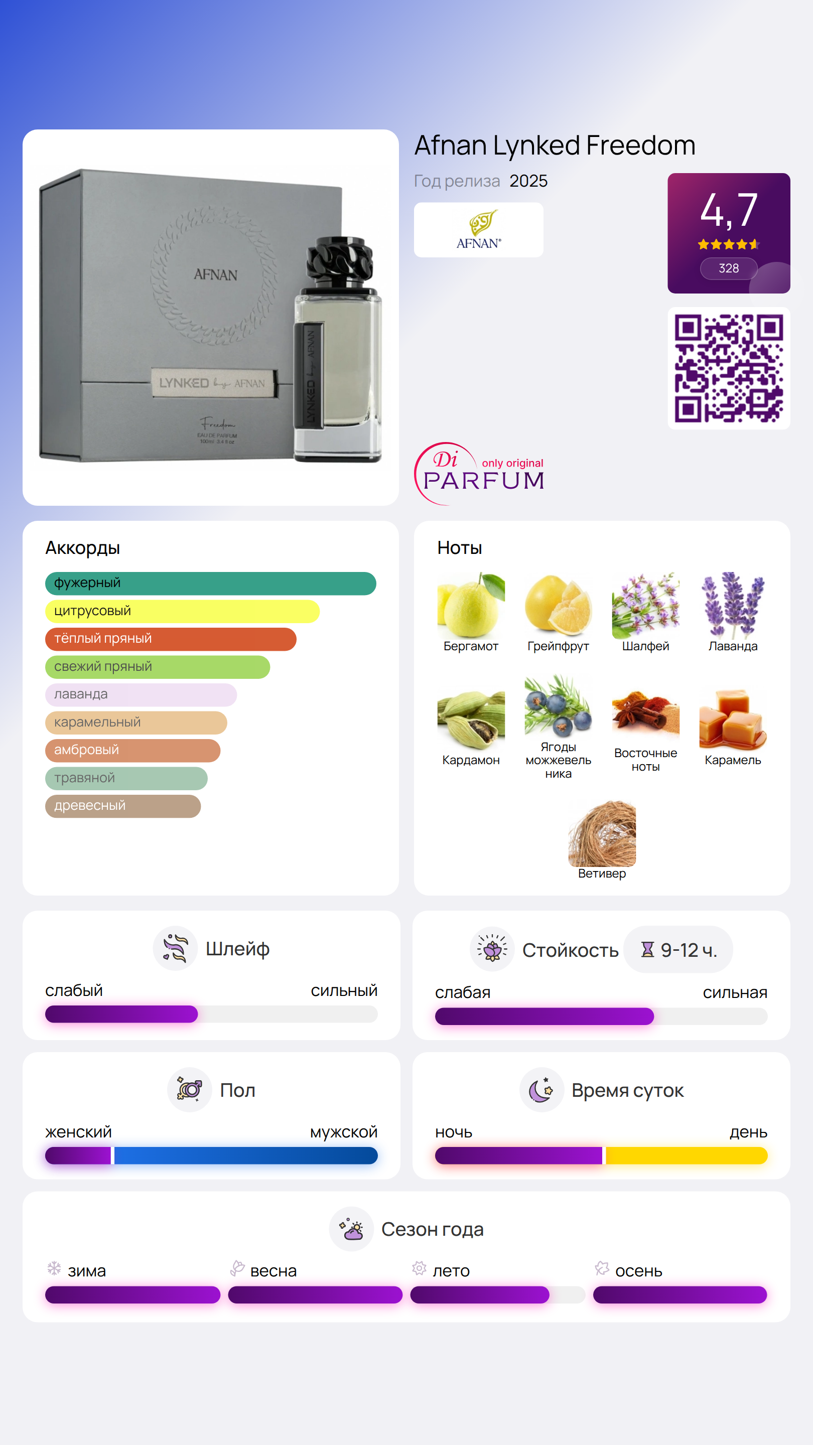 Этот аромат принадлежит к категориям цитрусовых и восточных, что делает его универсальным выбором как для повседневного использования, так и для особых случаев. Lynked Freedom будет отличным спутником для истинных ценителей ярких и многогранных парфюмерных композиций.