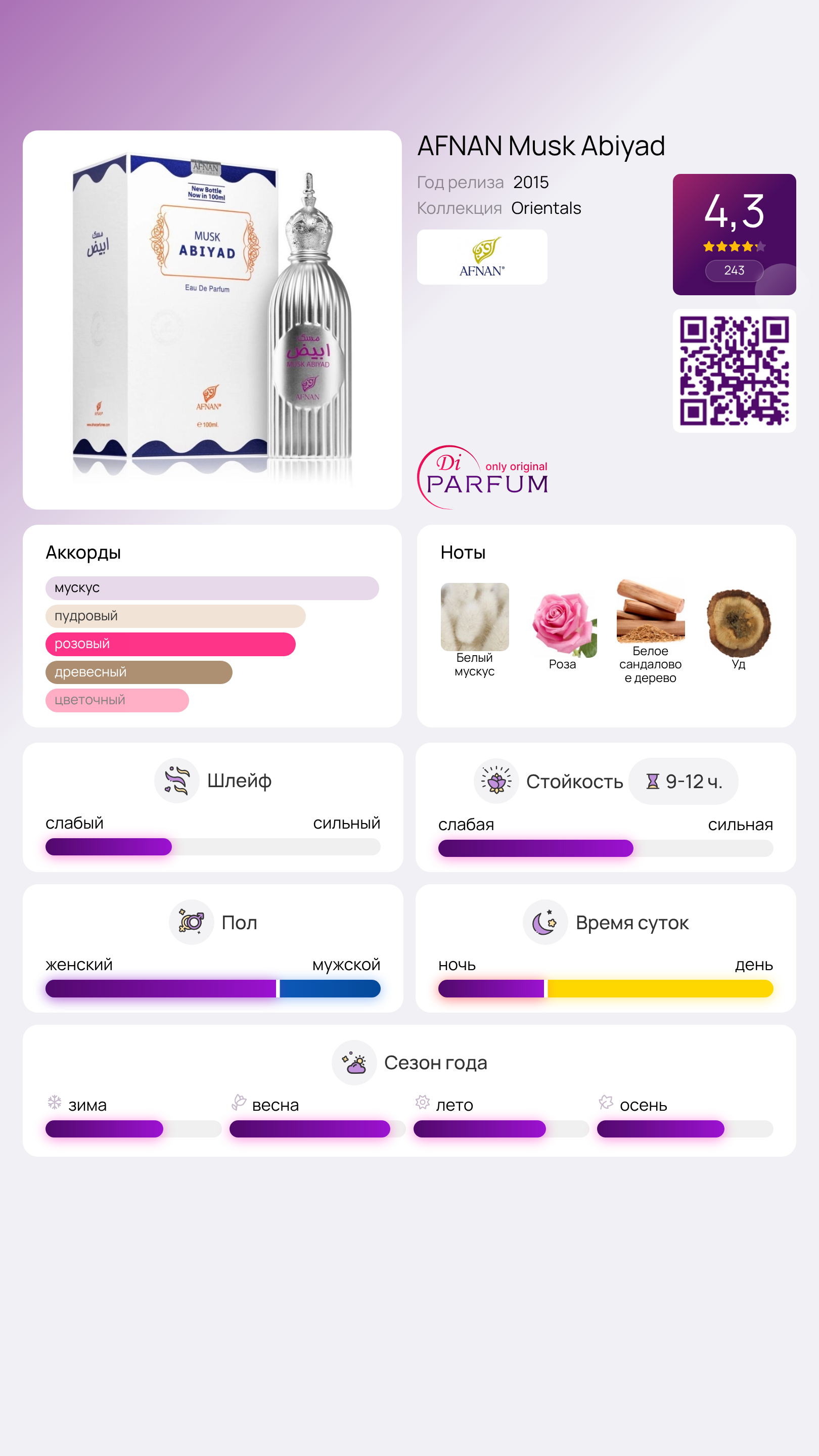 Лирический восточный аромат AFNAN Musk Abiyad обладает нежностью, подобной искреннему взгляду влюбленного. Он сочетает в себе загадочность Востока и освежающую красоту цветочных нот. Этот парфюм наполнен контрастами: он как ребенок и взрослый одновременно, как радость и печаль, как холод и тепло, воплотив в себе суть Женщины и ее мечты.
