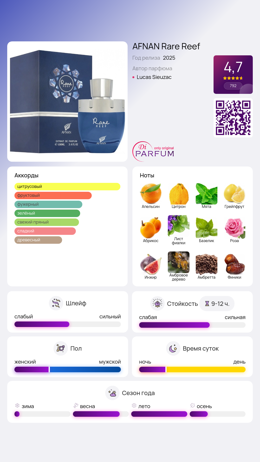 Rare Reef от Afnan — это ароматическая фруктовая композиция для женщин и мужчин. Этот новый парфюм был представлен в 2025 году и создан парфюмером Лукасом Сиузаком. В верхних нотах вы ощутите свежесть апельсина, цитрона, мяты, грейпфрута, черной смородины и кориандра; в сердце аромата раскрываются ноты абрикоса, листьев фиалки, базилика и розы; а в базе вас ждут теплые угольные акценты инжира, Amberwood, амбретты и фиников.