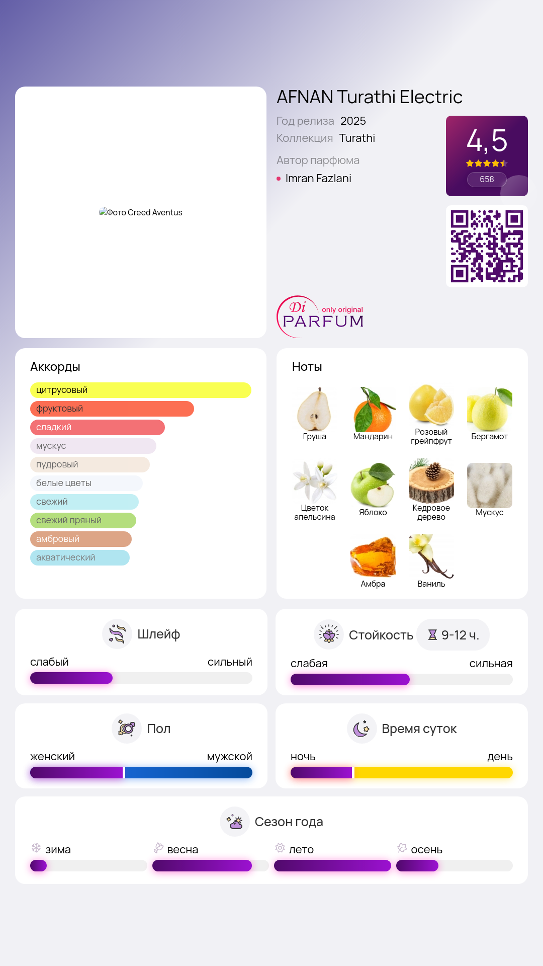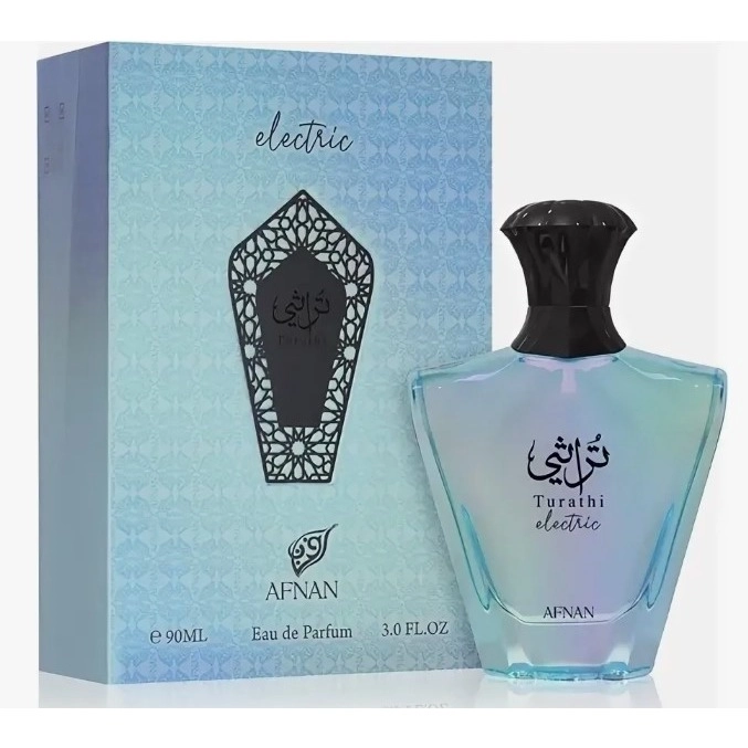 Turathi Electric от Afnan — это флорально-фруктовый аромат для женщин и мужчин, который был представлен в 2025 году. Создателем данного аромата является парфюмер Имран Фазлани. В верхних нотах вы ощутите свежесть груши, мандарина, розового грейпфрута и бергамота; в средних нотах звучат цветок апельсина, яблоко и кедр; базовые ноты составляют мускус, амбра и ваниль.