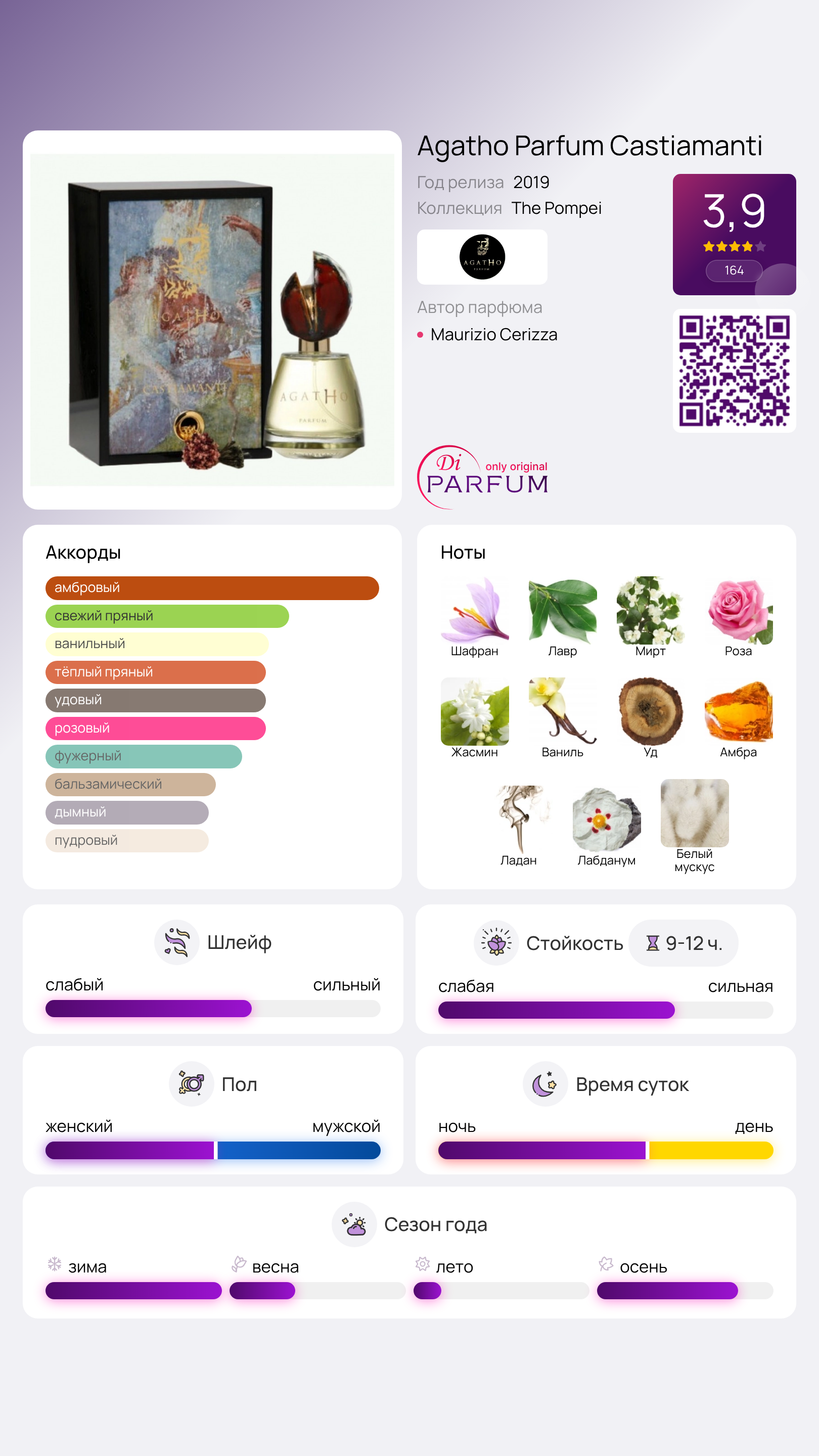 Этот уникальный аромат Castiamanti от Agatho Parfum впервые был представлен в 2019 году. Он предназначен как для мужчин, так и для женщин, которые умеют наслаждаться жизнью и ценят ее моменты. Бренд, представивший этот эликсир, имеет итальянские корни, уходящие в эпоху античной Помпеи, когда парфюмеры создавали изысканные ароматы для римской аристократии, используя старинные методы. Дизайн флакона напоминает расколотый мраморный шар и выполнен из высококачественного стекла с мягкими и обтекаемыми линиями.