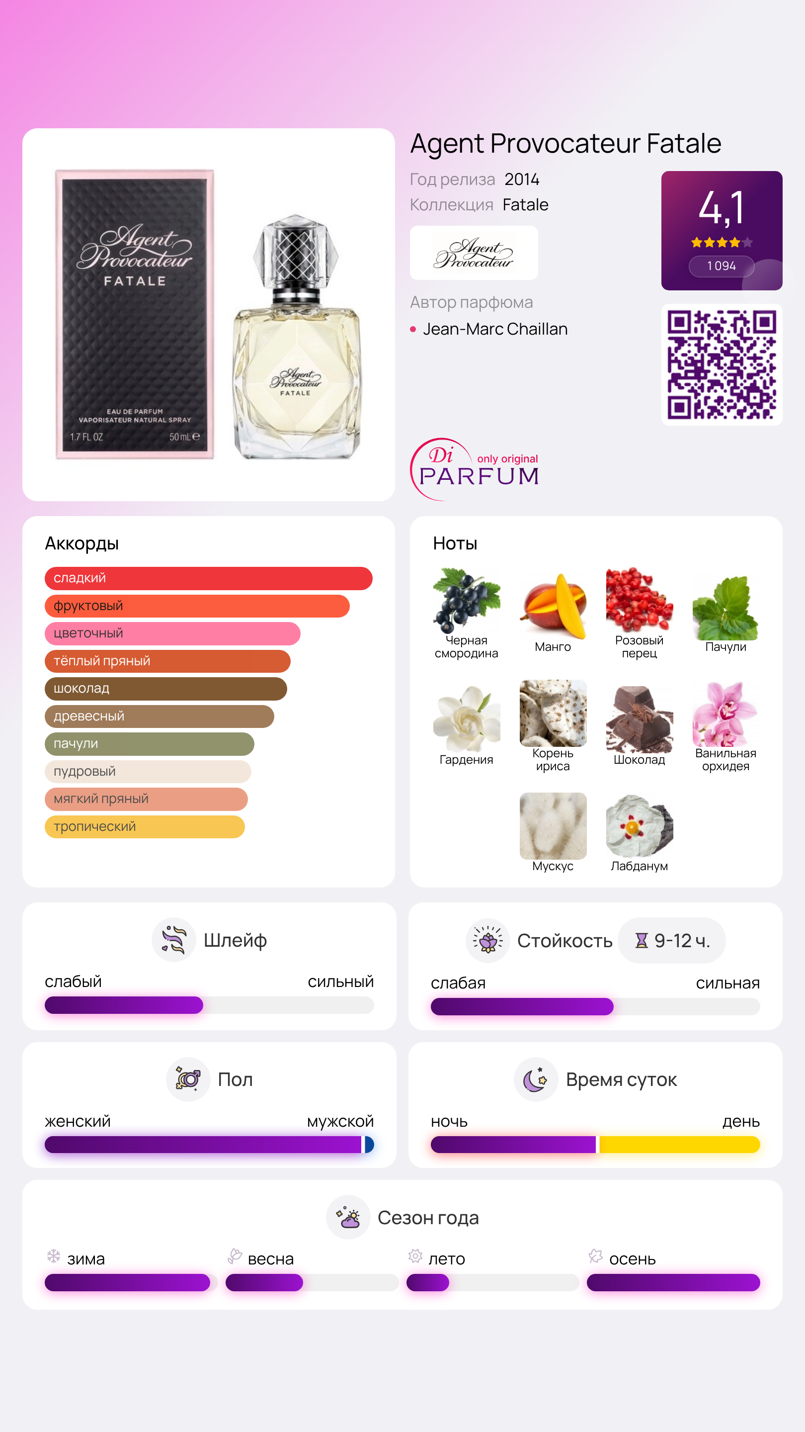 В базе чувственно переплетаются ванильная орхидея, насыщенный лабданум, тёплый шоколад и привлекательный мускус.