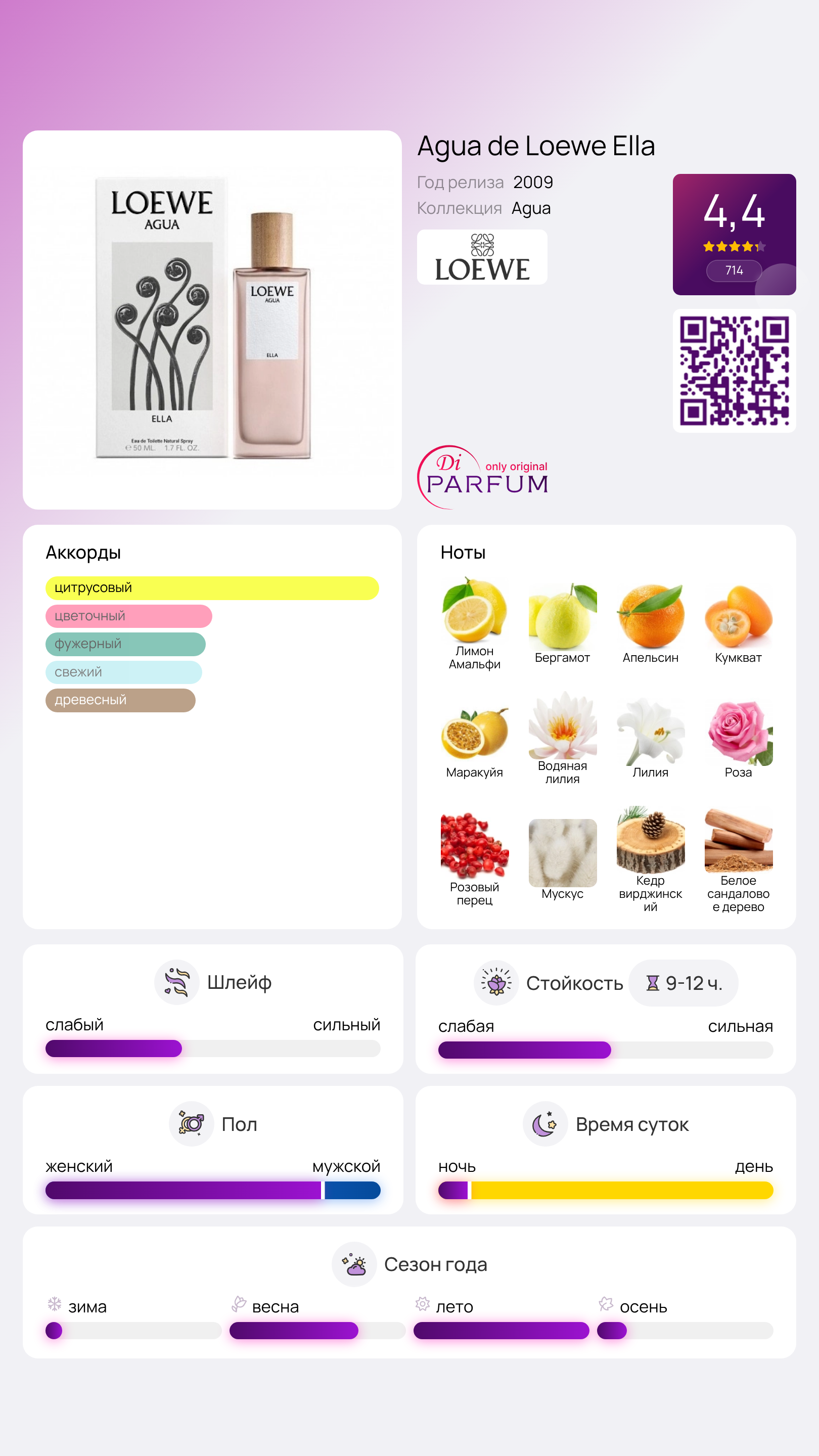 Изящный флакон нежно-сиреневого цвета с матовой текстурой и металлической крышкой, напоминающей о старинных печатях, добавляет очарования. Верхние ноты аромата включают в себя свежие фрукты, такие как бергамот, кумкват, пассифлора и лимон. В сердце композиции соединены водяная лилия, бурбонский перец и роза, а базовые ноты раскрываются сандалом, марокканским кедром и мускусом.