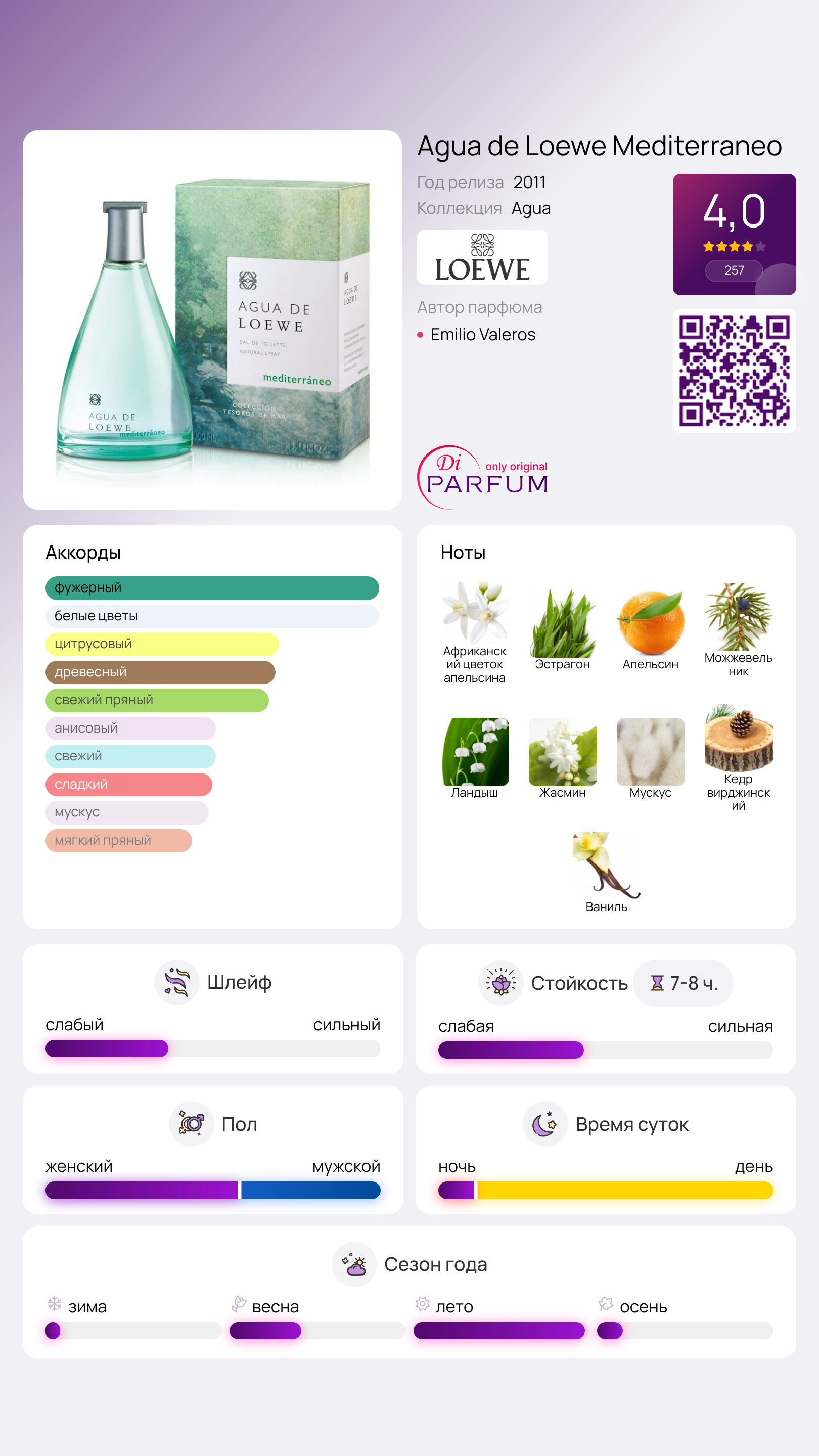 Этот унисекс-фригмент гармонично раскроется как на женской, так и на мужской коже. Запуск аромата состоялся в 2011 году.
