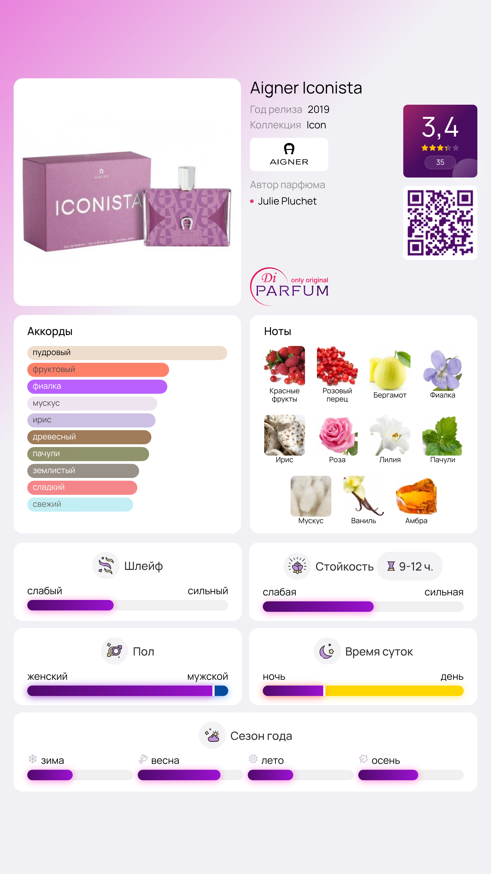 Iconista от Aigner была выпущена в 2019 году вместе с гелем для душа и лосьоном для тела. Этот аромат ориентирован на страстных и романтичных женщин, которые знают, чего хотят. Изящный фиолетовый флакон, обтянутый кожей и оформленный модным логотипом, выглядит как эксклюзивный женский клатч. Французский бренд известен не только своими парфюмами, но и высококачественными кожаными аксессуарами.