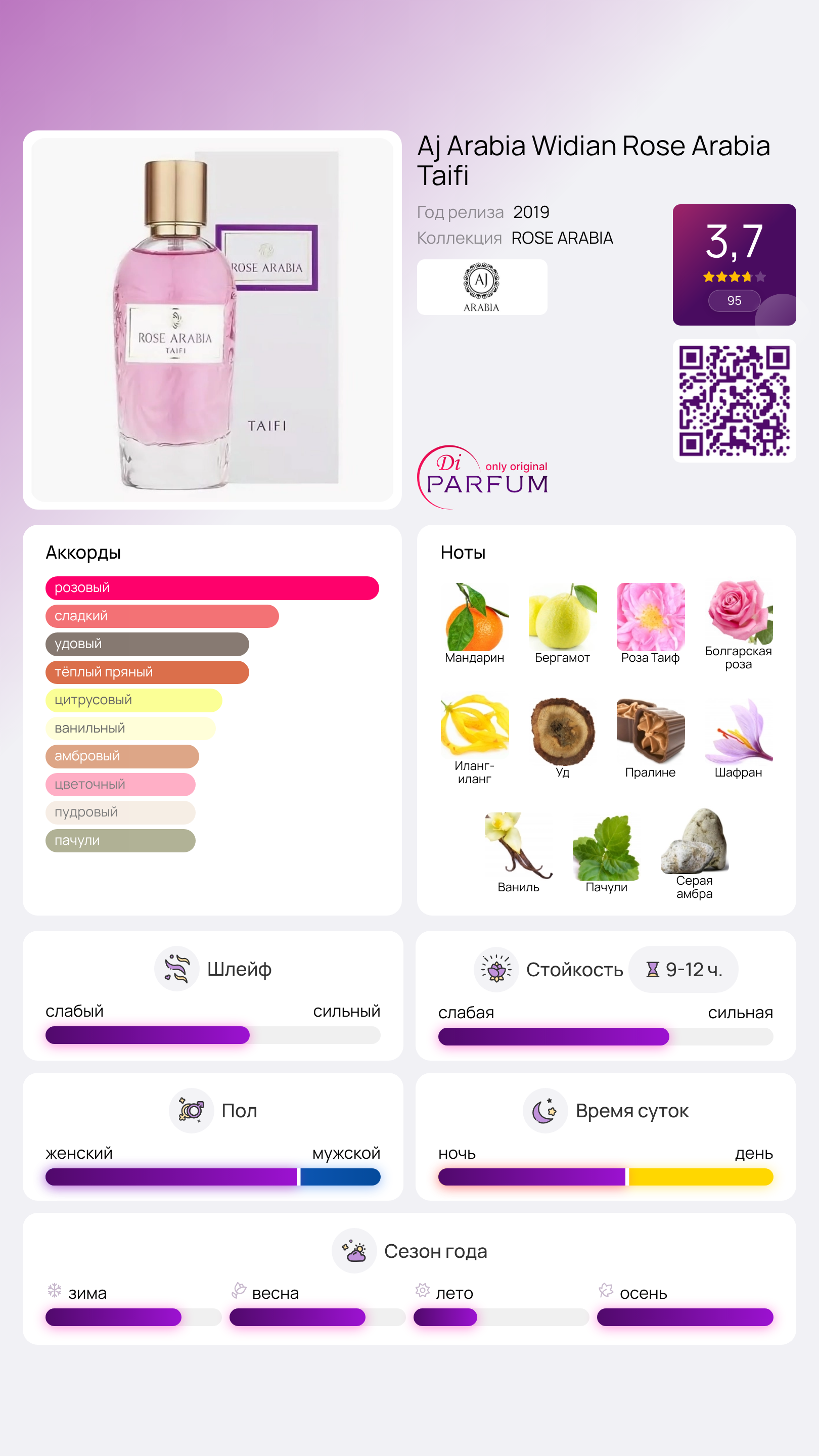 Открываясь свежими цитрусовыми нотами, ольфакторный треугольник Widian Rose Arabia Taifi наполняется сладким мандарином и легкой горечью бергамота, образующими яркий и жизнеутверждающий тандем. В сердце аромата распускаются роскошные цветы таифской розы, которые гармонично соединяются с нотой утонченной болгарской розы, создавая восхитительную флоральную мелодию. Динамичность аромата подчеркивается насыщенными аккордами экзотичного иланг-иланг.