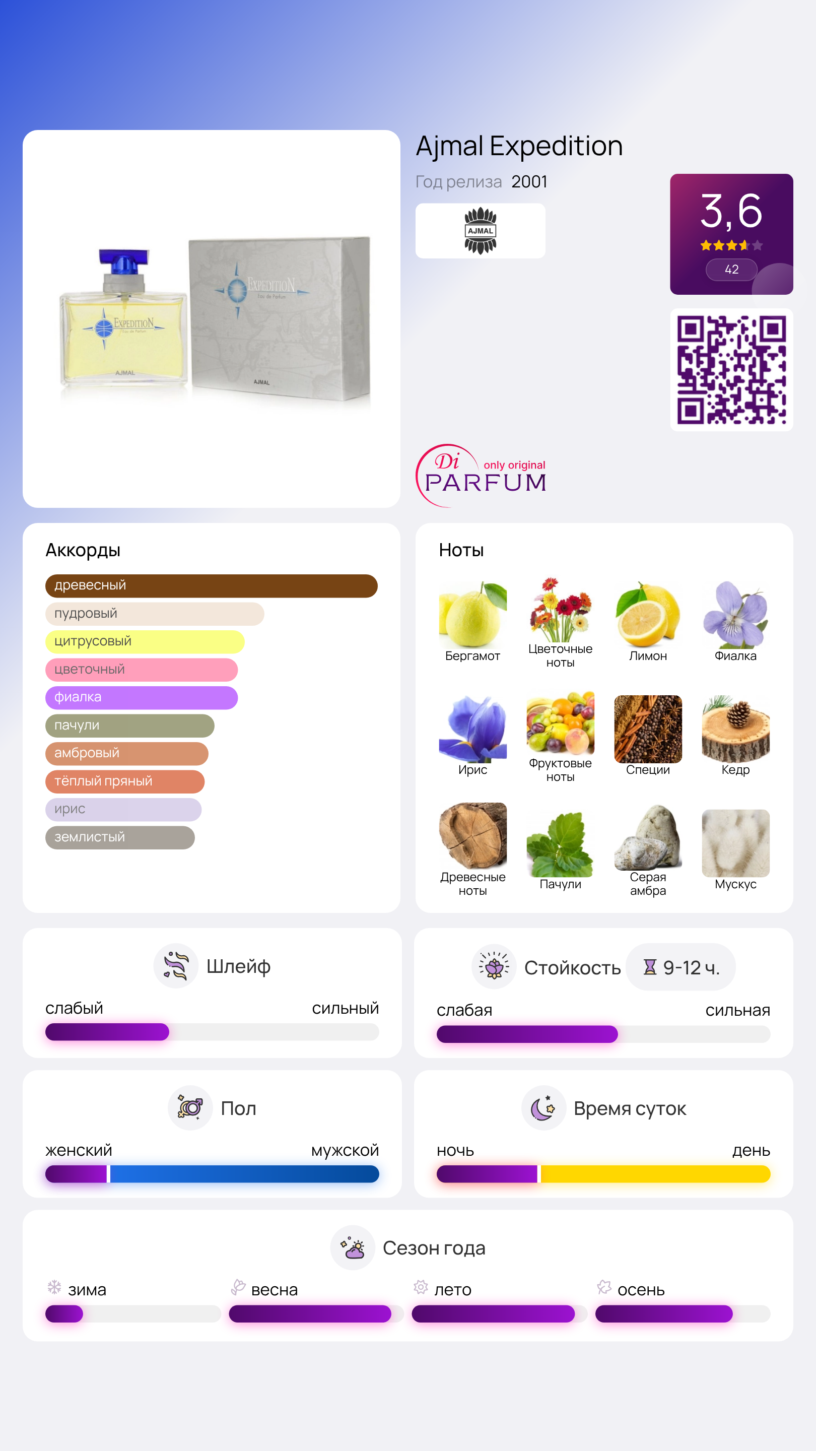 Средние ноты содержат пленительные ароматы фруктов, пряностей, а также фиалки и ириса, что создает богатую текстуру. В завершении раскрываются древесные ноты вместе с кедром, мускусом, пачули и серой амброй, создавая утончённый шлейф. Expedition станет настоящим открытием для любителей стойких и запоминающихся ароматов.
