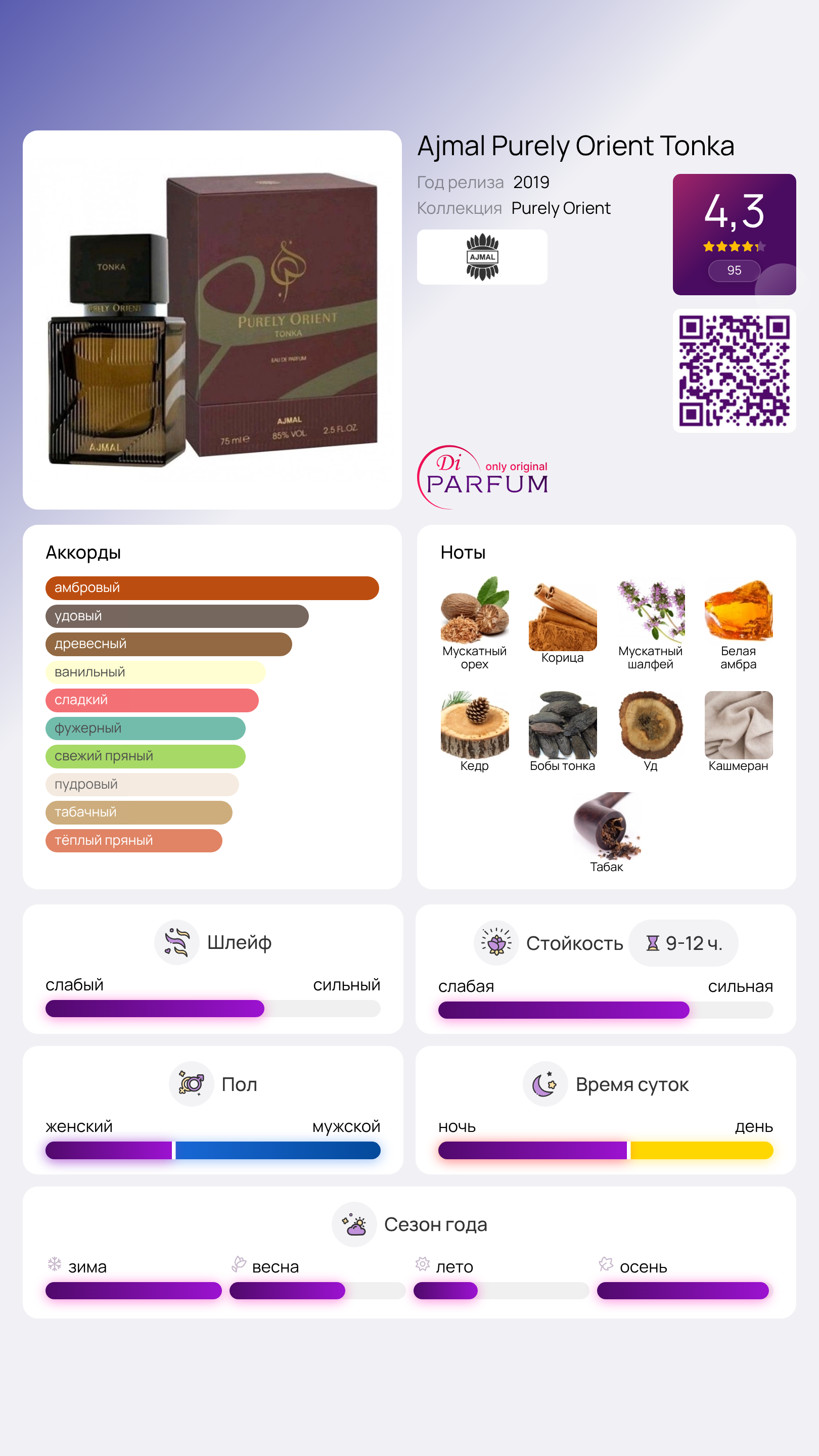 Древесные акценты, животные полутени и ароматные травы имеют привлекательный эффект как для мужчин, так и для женщин. В приятном дымке табака ощущается благородство истинного джентльмена. Роскошный парфюм Purely Orient Tonka от Ajmal был представлен в 2019 году как часть коллекции Purely Orient, которая была адаптирована для европейского потребителя. Этот волшебный эликсир особенно хорош в холодное время года.
