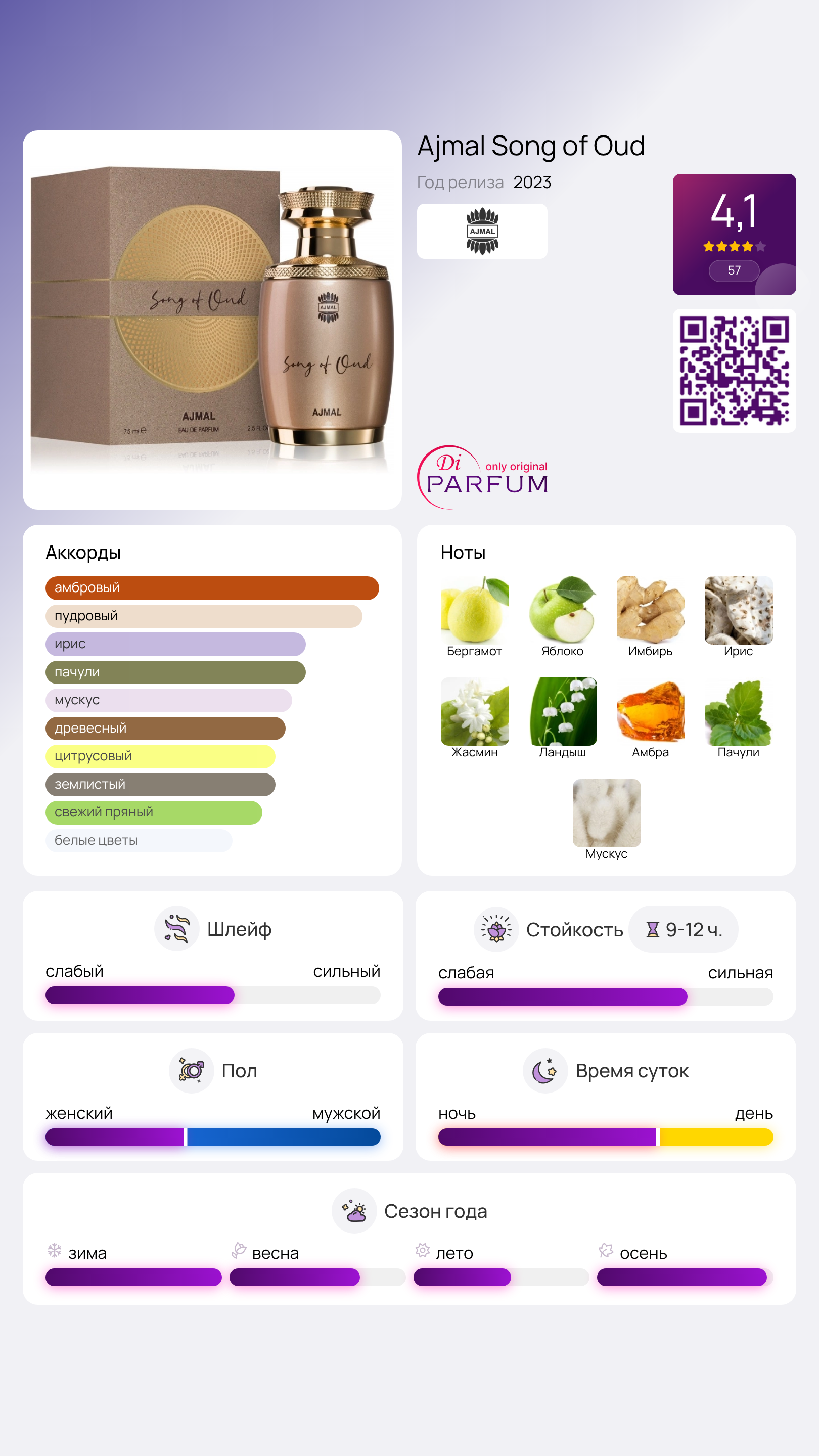 Ajmal Song of Oud – это утонченный и стильный парфюм, созданный для мужчин и женщин, который был представлен арабским брендом в 2023 году. В его цветочно-восточной композиции парфюмеры слили магию и традиции Востока с современными европейскими элементами элегантности.
