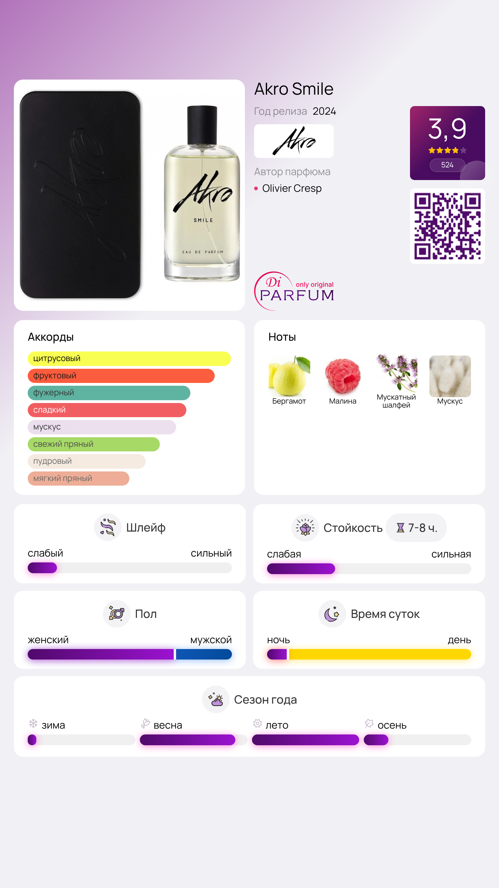 Мускус в базе устойчиво закрепляет все ноты, предоставляя длительное послевкусие. Откройте для себя радость любви, улыбки и смеха, которые вложены в Akro Smile. Эти эмоции созданы для того, чтобы ими делиться!