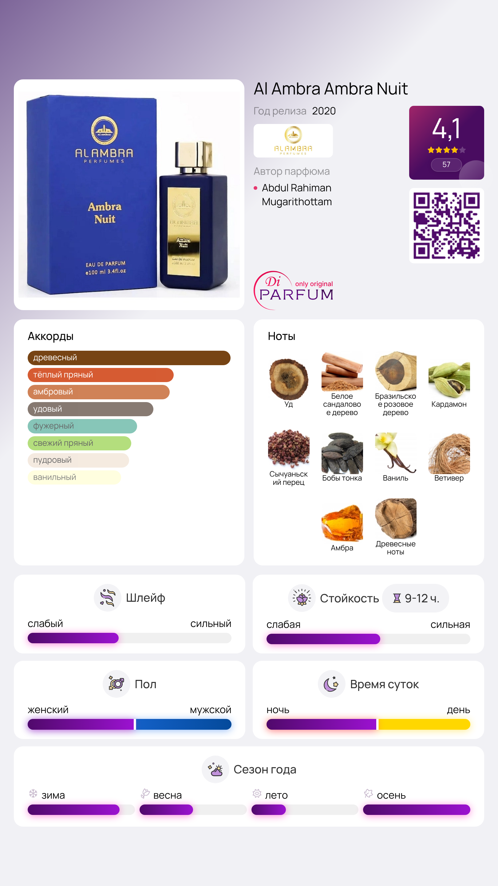 Amber Nuit от Al Ambra — это универсальный аромат, подходящий как для женщин, так и для мужчин. Выпущенный в 2020 году, этот парфюм создан талантливым парфюмером Абдулом Рахиманом Мугиратотамом. Amber Nuit погружает вас в мир восточной таинственности и древесной роскоши.