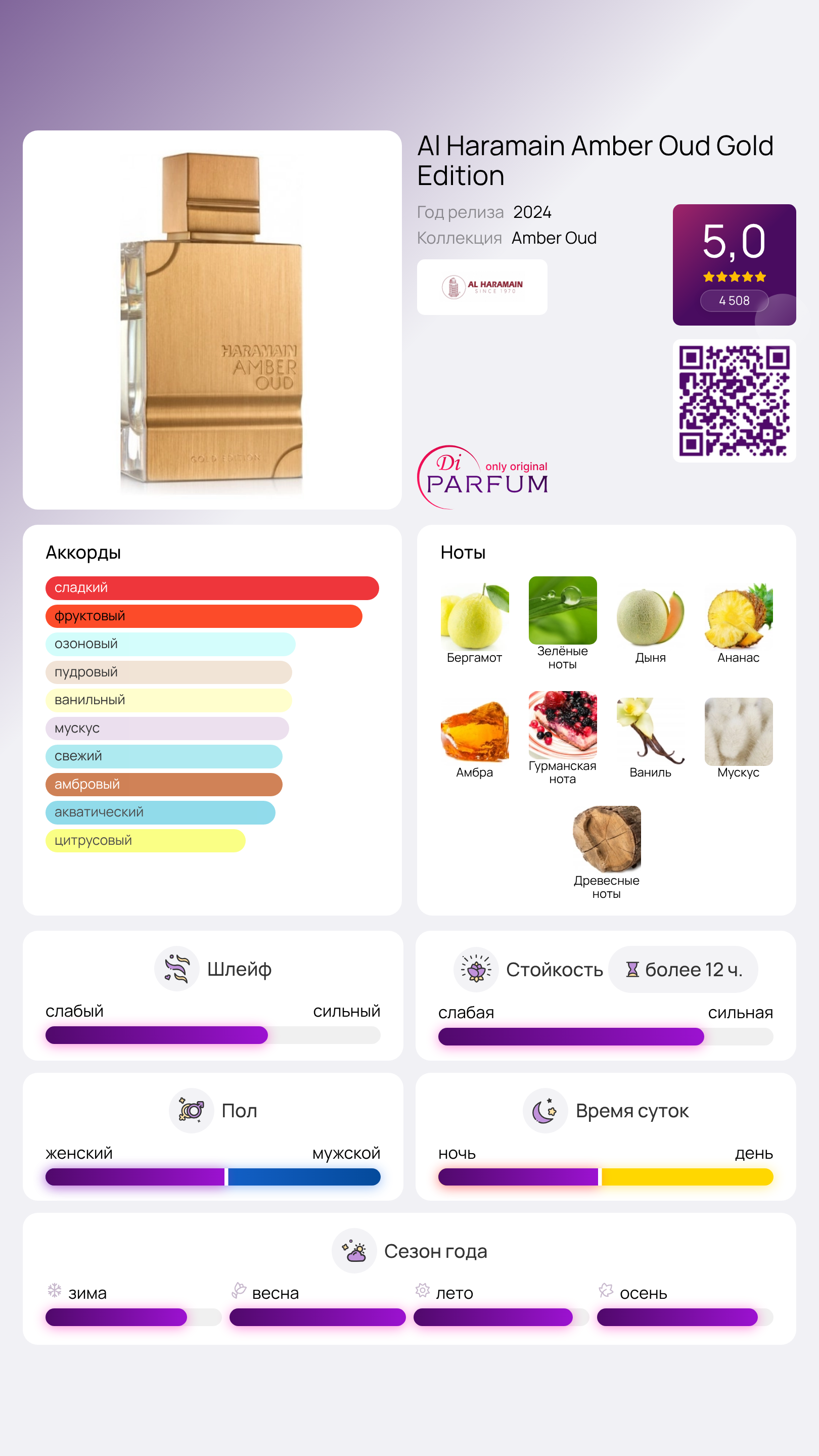 Восточные ароматы требуют особого внимания и уважения. Их создание представляет собой сложную задачу, доступную только истинным мастерам. Арабские парфюмеры обладая непревзойденным талантом, превосходно справляются с составлением таких композиций. Например, парфюм Al Haramain Perfumes Amber Oud Gold Edition создан на основе натуральных компонентов, отличается выдающейся стойкостью и обладает насыщенным, продолжительным шлейфом.