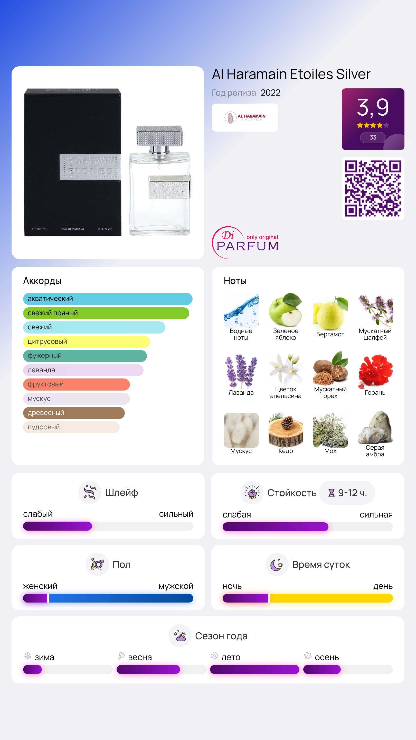 Лирический персонаж аромата Al Haramain Etoiles Silver – это изысканный и харизматичный мужчина, обладающий силой и внутренней уверенностью. Он сдержан и мужественен, но в то же время способный на глубокие эмоции и чувственность. Композиция аромата, отличающаяся строгим и лаконичным звучанием, провоцирует размышления и позволяет заглянуть внутрь себя, чтобы найти пересечение между мечтами и реальностью.