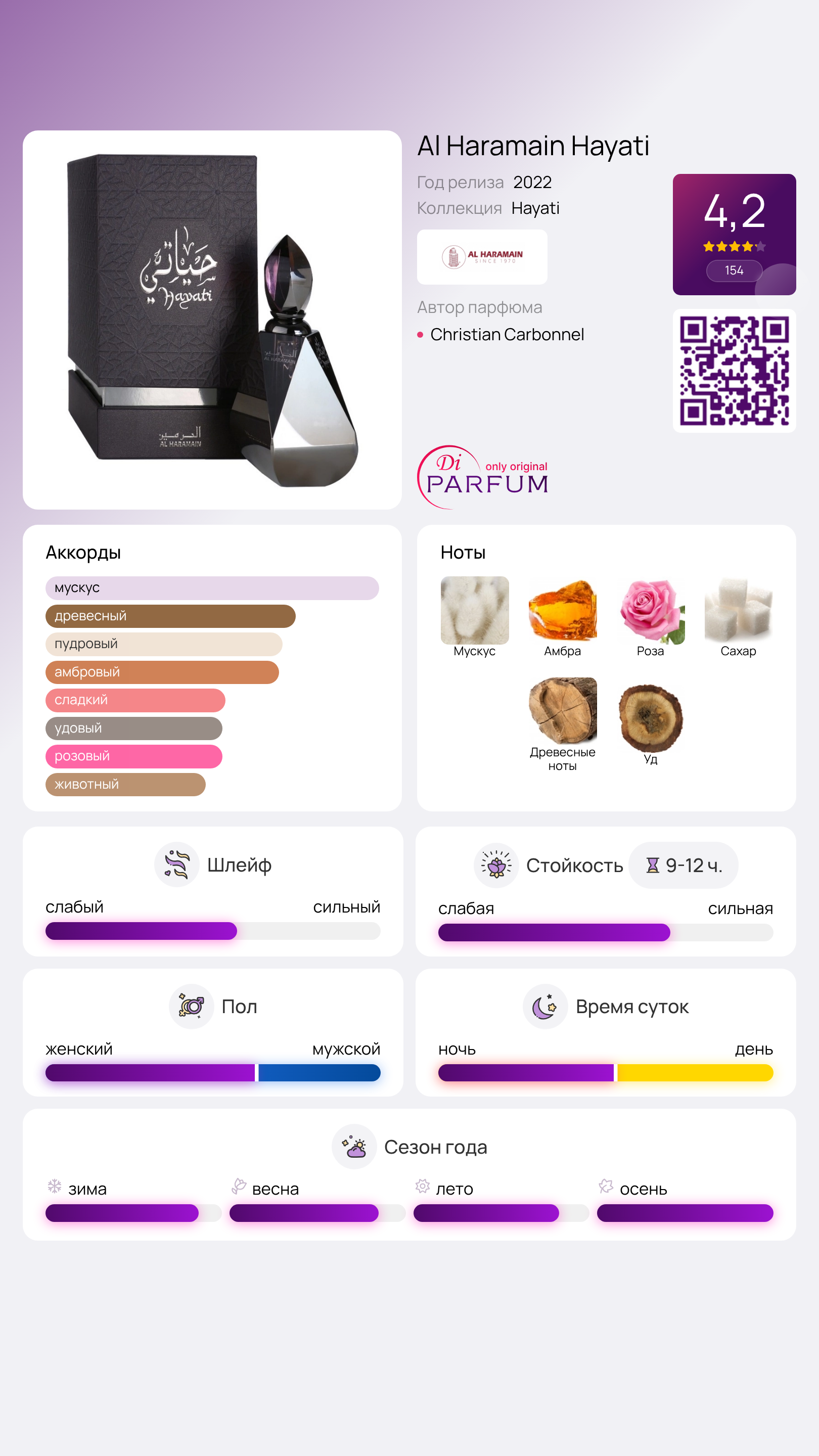 Шлейф аромата одновременно сексуален и деликатен, притягивает и завораживает. Темная магия уда и теплые древесные ноты формируют беспроигрышное музыкальное сочетание. Композиция Hayati от Al Haramain действует как магическое зелье, притягивая внимание противоположного пола. А благодаря использованию высококачественных ингредиентов, стойкость аромата составляет более суток. Элегантный черный флакон из горного хрусталя напоминает подобие драгоценного камня.