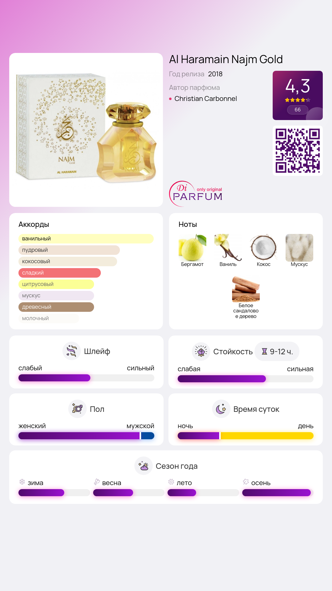 Najm Gold от Al Haramain Perfumes – это великолепный восточно-венильный аромат, который подойдет как для женщин, так и для мужчин. Выпущенный в 2018 году, он создан талантливым парфюмером Кристианом Карбоннелем.