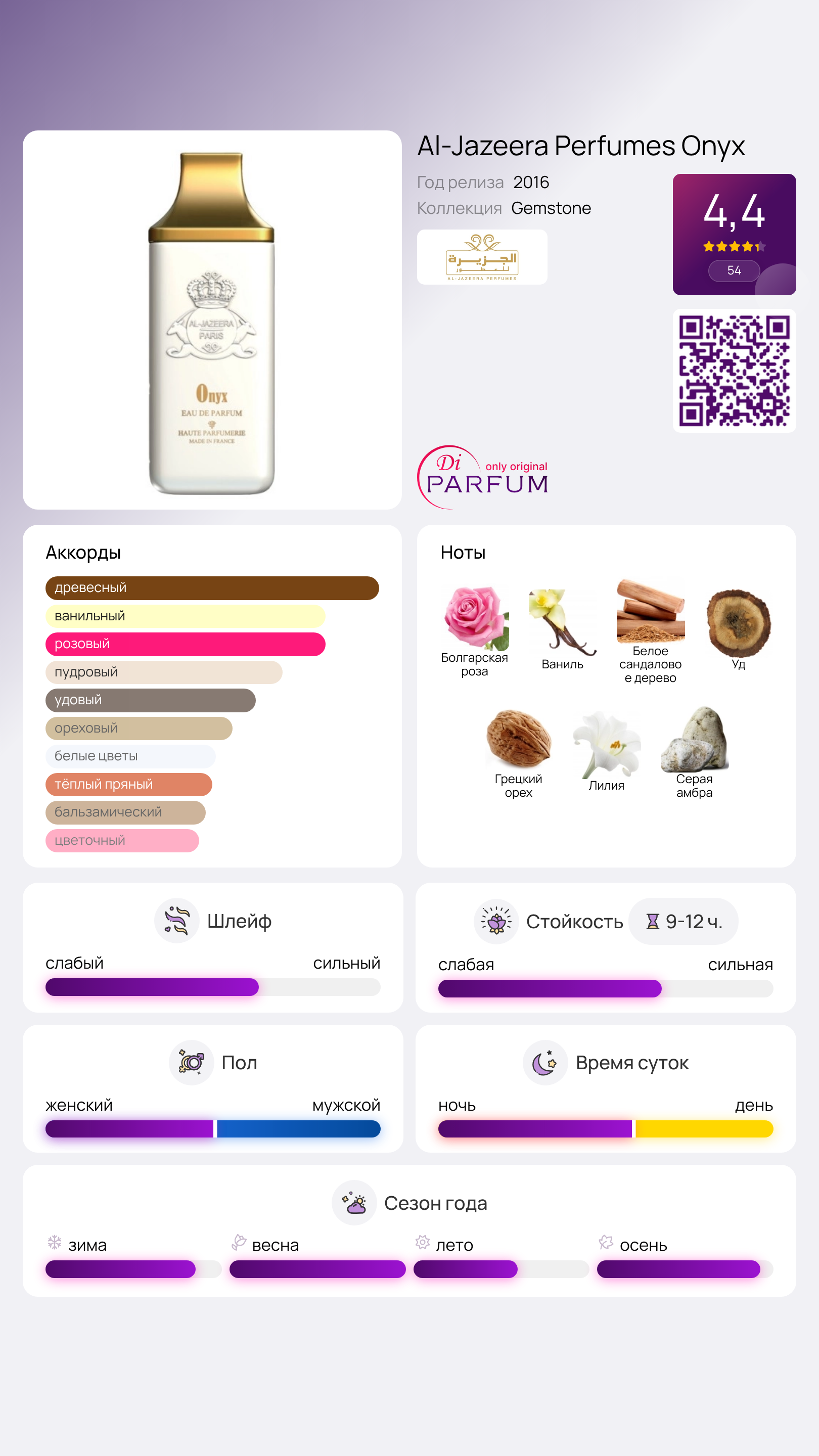 Композиция Onyx от Al-Jazeera Perfumes излучает изысканность и создана известным катарским брендом. Флакон молочно-белого цвета напоминает о естественном камне, а золотистая крышечка ассоциируется с восточной роскошью.