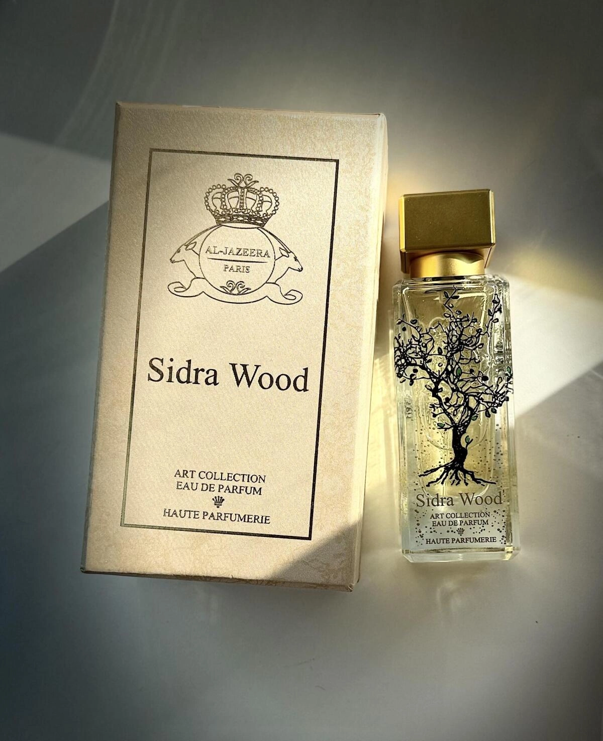 Композиция Sidra Wood от Al-Jazeera Perfumes вышла в 2023 году как часть Art Collection. Этот старинный катарский бренд производит парфюмерию как на Ближнем Востоке, так и в Париже, и в создании ароматов участвуют как европейские, так и арабские парфюмеры. Флакон обладает эффектным прозрачным дизайном, украшенным объемным флористическим изображением дерева.