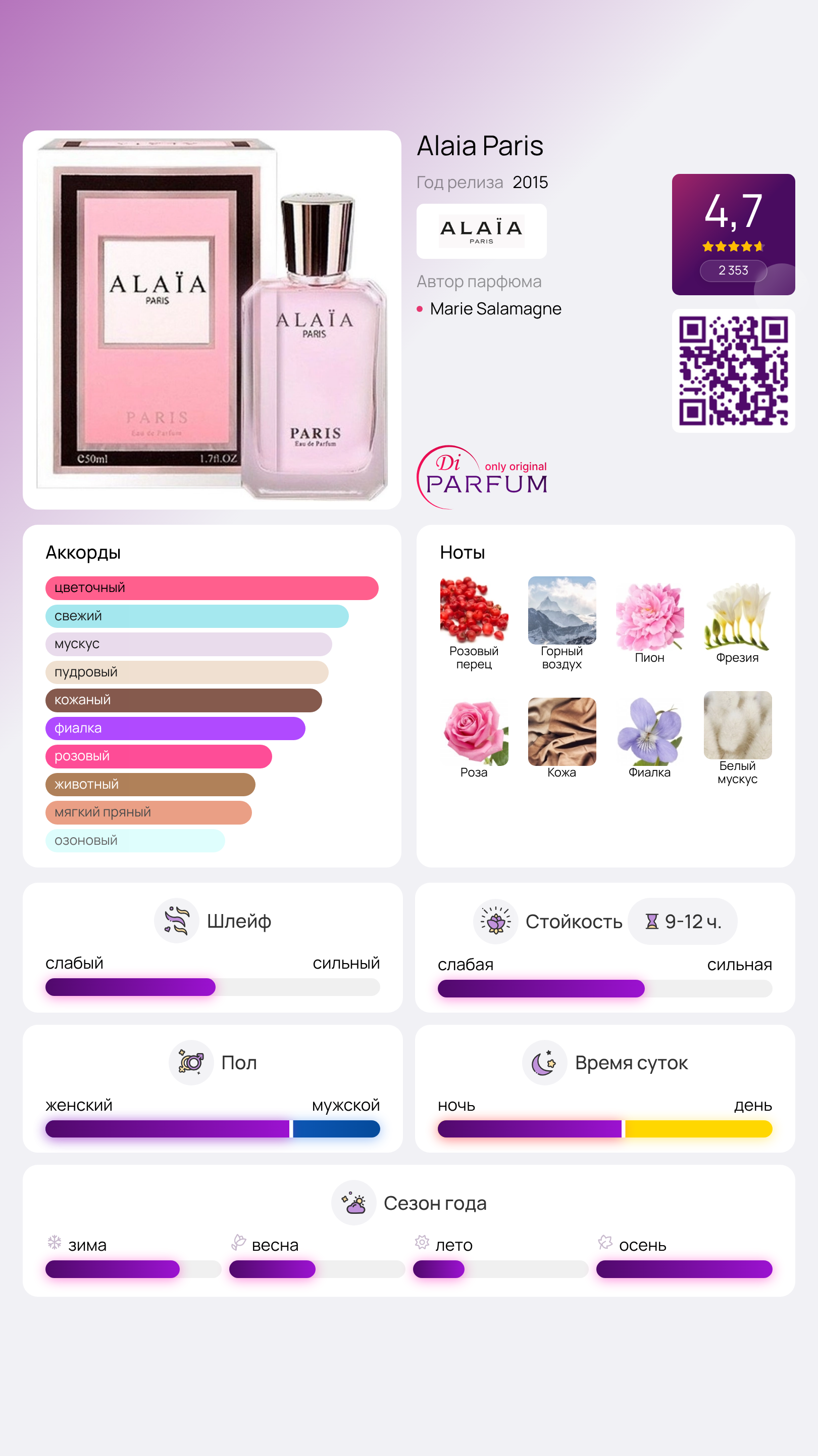 Парфюмерная структура аромата Paris от Alaia одновременно проста и многослойна. Ароматизация начинается с игривого и пикантного звучания розового перца, которое создает интригующий и обескураживающий эффект с первых секунд. Обаяние этого мастерски составленного аромата усиливается в его сердечной части, где нотки грациозной фрезии и благоухающего пиона затмевают сладковато-специевый верхний слой композиции. Завершает эту гармоничную мелодию колдовское цветочно-мускусное послевкусие, окутывающее загадочной дымкой и погружающее в мир грез и волшебства.