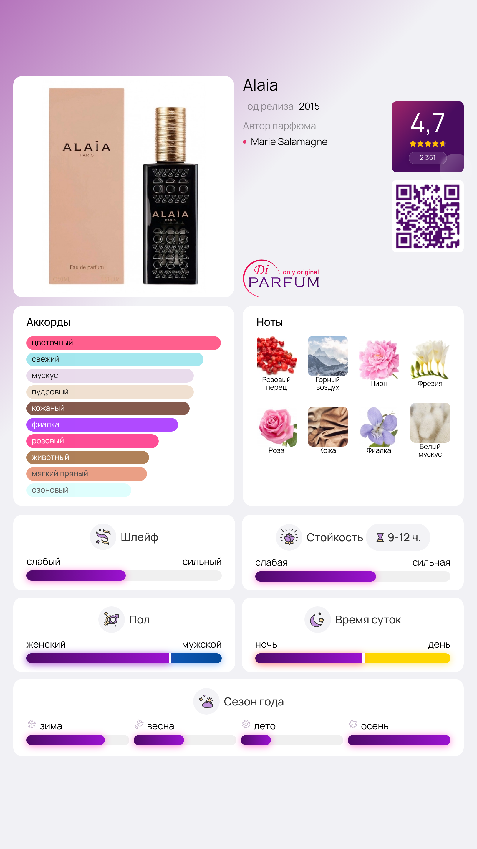 Парфюм Алайя подходит как для стильной студентки в черной одежде, так и для роковой красавицы, выходящей из дома с ярким смоки-макияжем и высокими каблуками. Это аромат, который олицетворяет характер и красоту, завораживает и вызывает вопросы, но не отпускает воображение своим настойчивым и свежим шлейфом.