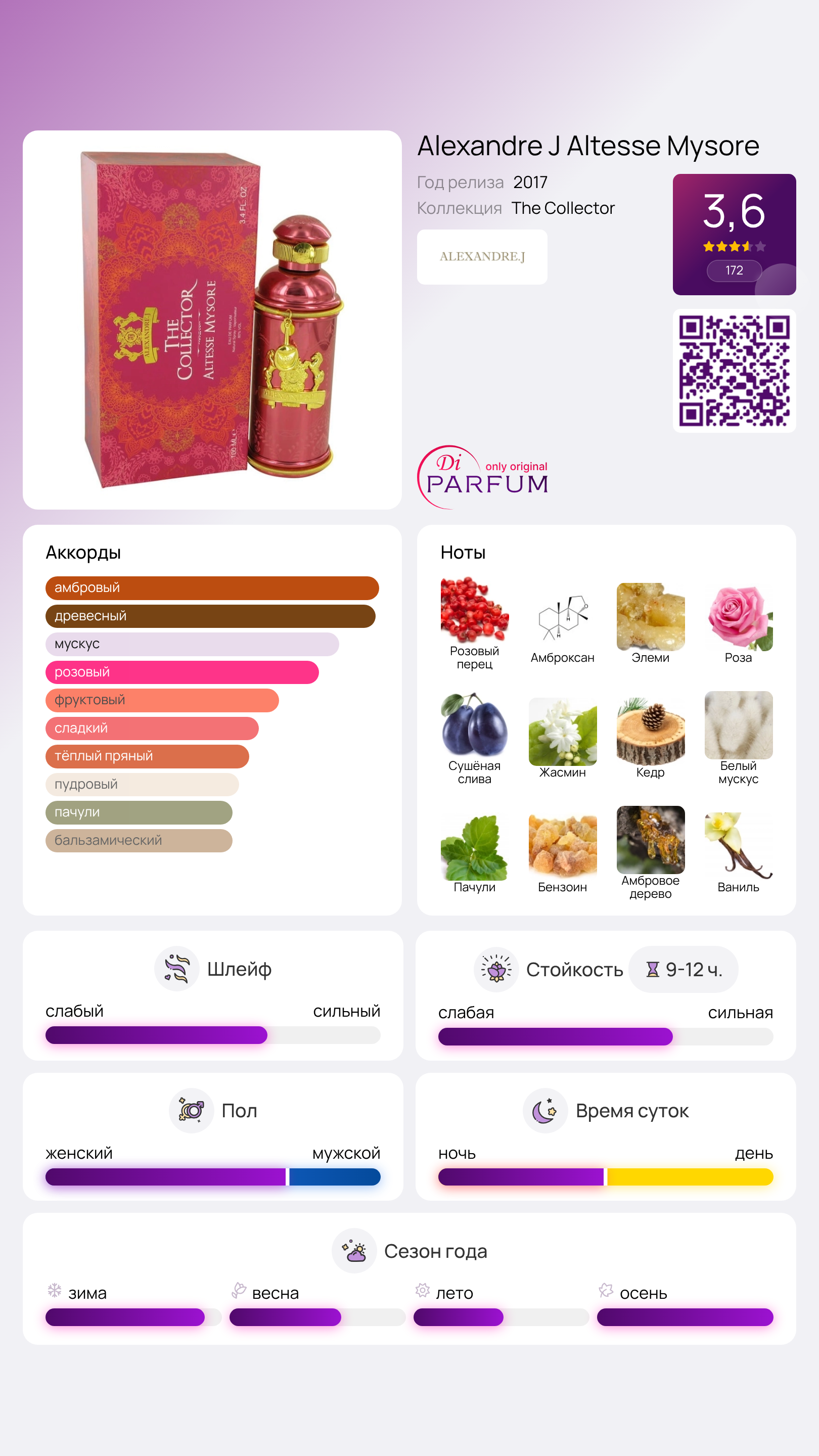 В 2017 году новый парфюм для женщин Altesse Mysore от Alexandre J привлек внимание поклонниц восточных цветочных ароматов. Этот аромат стал заметным дополнением к коллекции The Collector.