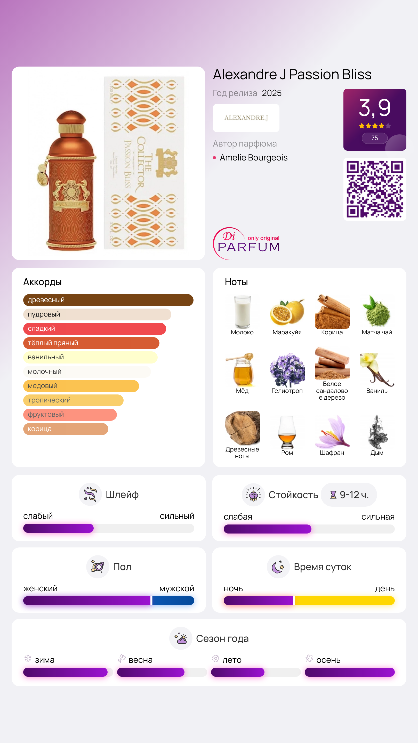Аромат Alexandre J Passion Bliss, богатый и манящий, подойдёт как мужчинам, так и женщинам, которые не боятся привлекать к себе внимание. Интенсивные эмоции, которые он вызывает, дополняются эффектным оформлением — яркий флакон обёрнут в мягкую кожу, словно настоящая драгоценность, что придаёт ему особую привлекательность.