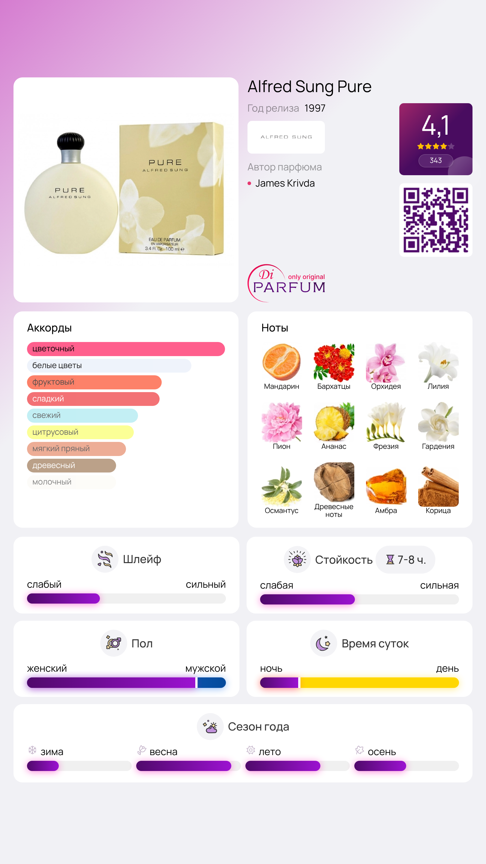 Название аромата Pure от Alfred Sung лаконично и выразительно отражает его суть. Pure символизирует возвращение к чистоте природы, соединение с её безграничной энергией. Этот изысканный букет включает в себя прекрасные белые цветы: китайский пион, ананасовую лилию, мягкую фрезию и нежную гардению.