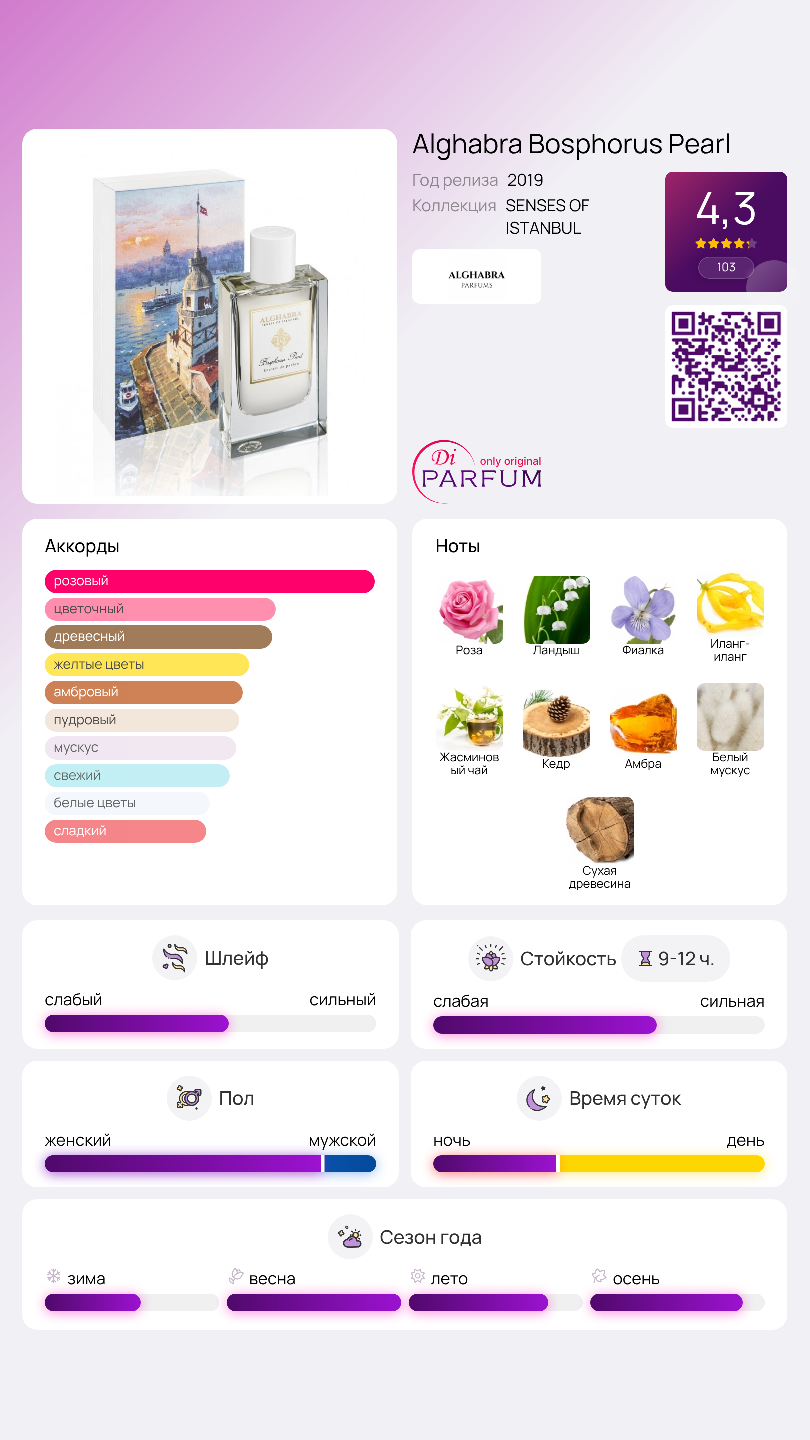 Теплота шлейфа аромата приносит ощущение умиротворения, создавая легкий аромат древесины dry wood и дымного белого кедра. Нежный белый мускус переплетается с восточными мотивами солоновато-смолистой амбры, создавая интригующую композицию. Bosphorus Pearl от Alghabra представляет парфюмерные традиции Турции, древние тайны и легенды Стамбула, нежно обвивая кожу мужчин и женщин богатством своих аккордов.