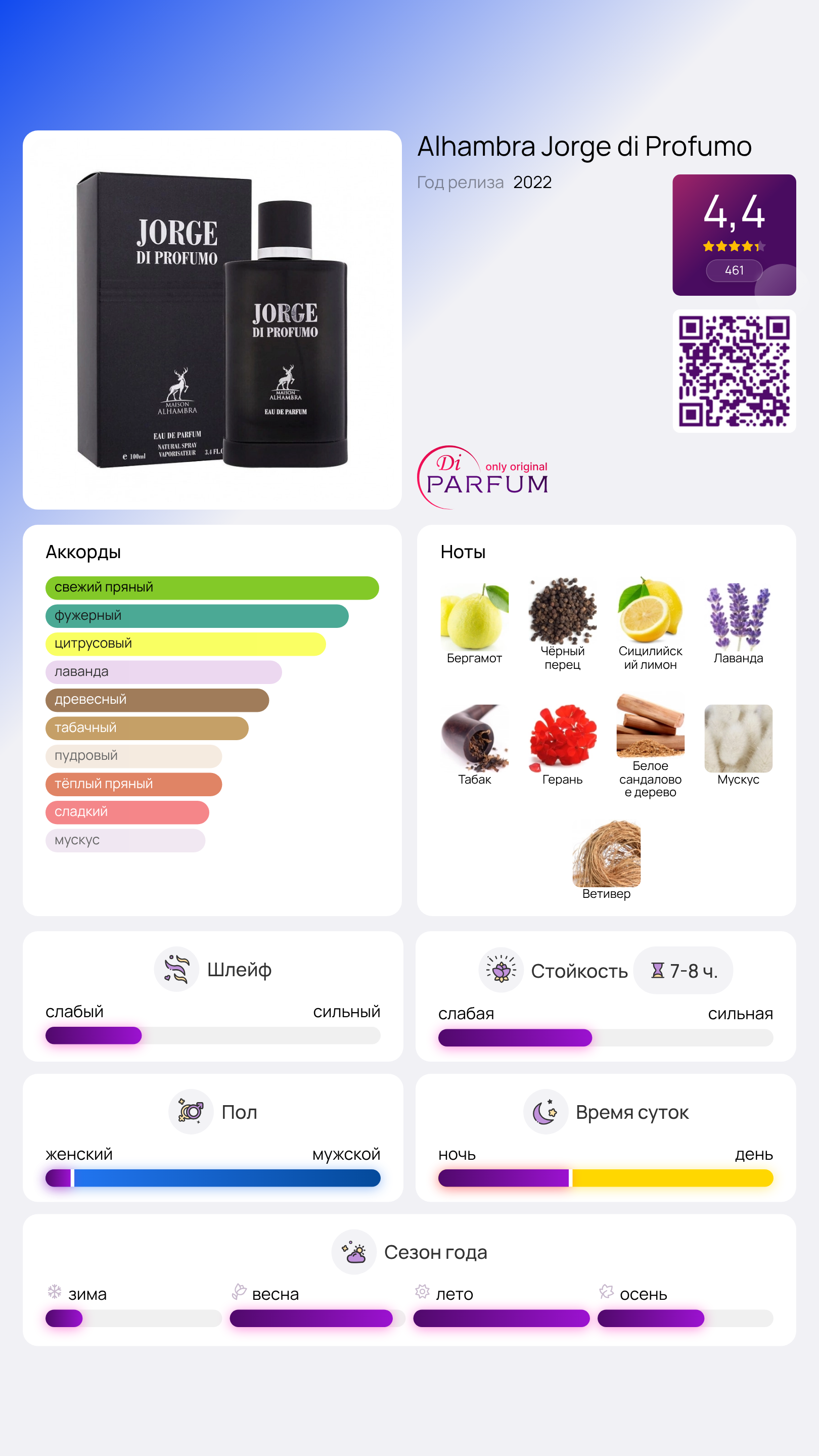 Jorge di Profumo от Maison Alhambra — это ароматическая парфюмерная композиция для мужчин, представленная на рынке в 2022 году. Этот аромат сочетает в себе великолепные ноты, которые создают уникальную и запоминающуюся атмосферу.